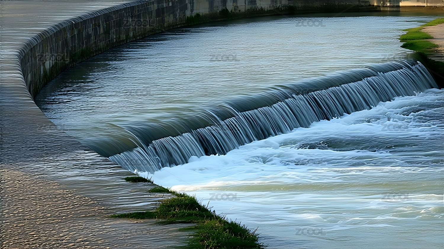 流经西宁市湟水河上的水坝前形成的水流瀑布
