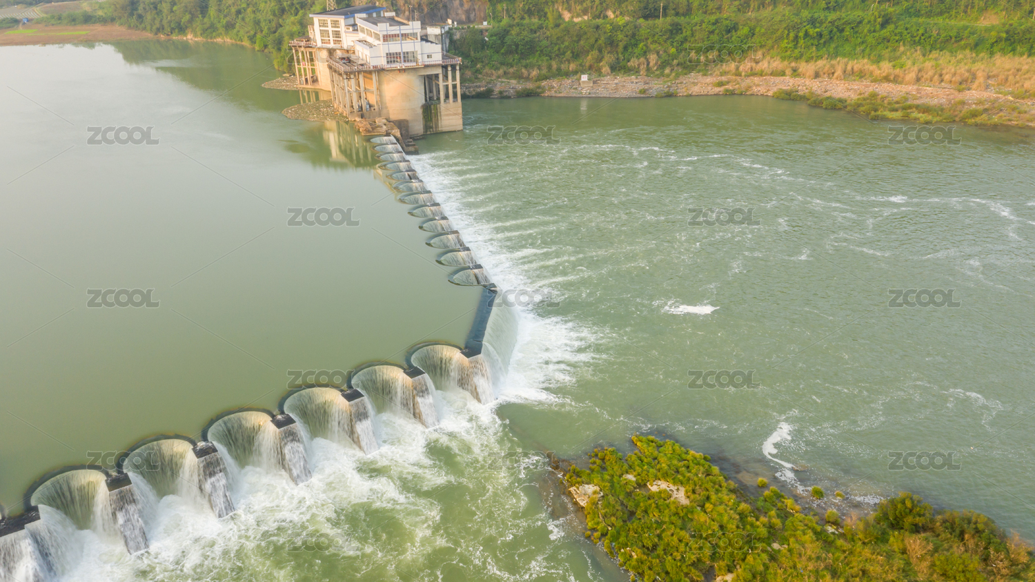 航拍春季广西柳州鹿寨县的水电堤坝和小岛
