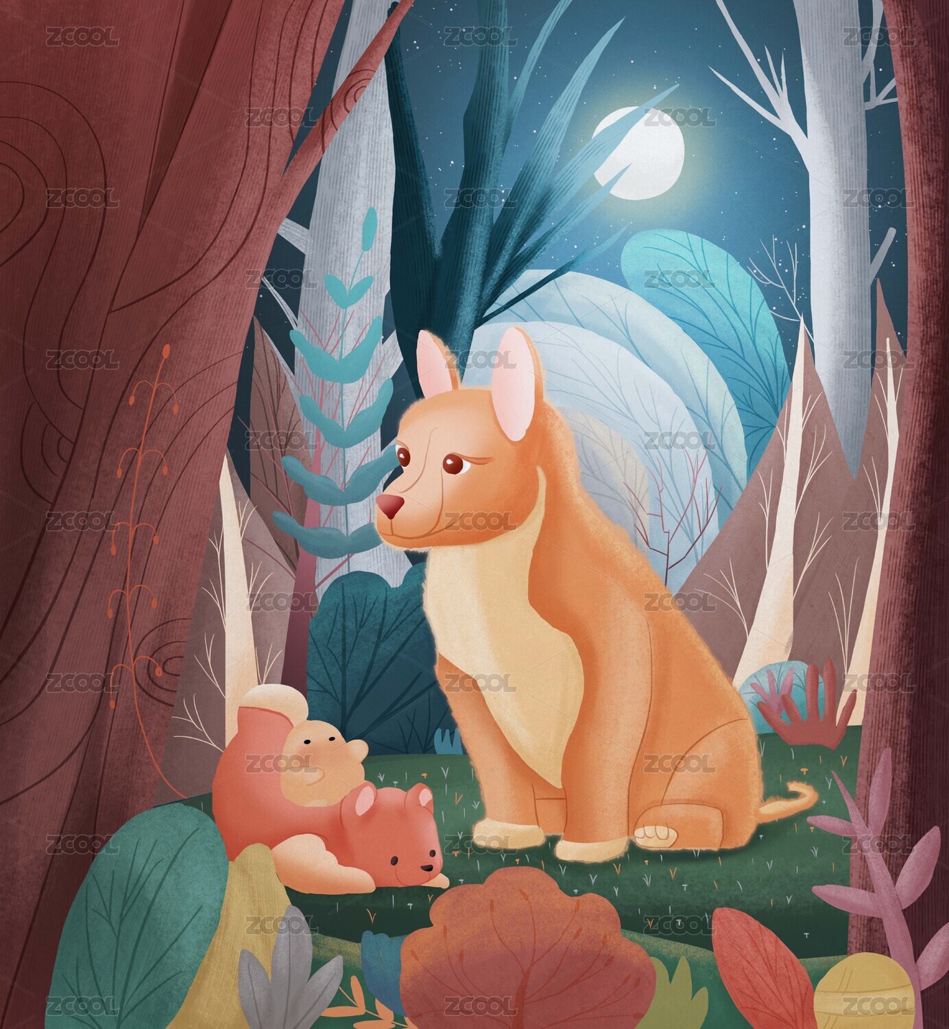 女孩,女生,森林,夜晚,熊,童年,插画,竖幅,小清新,治愈系