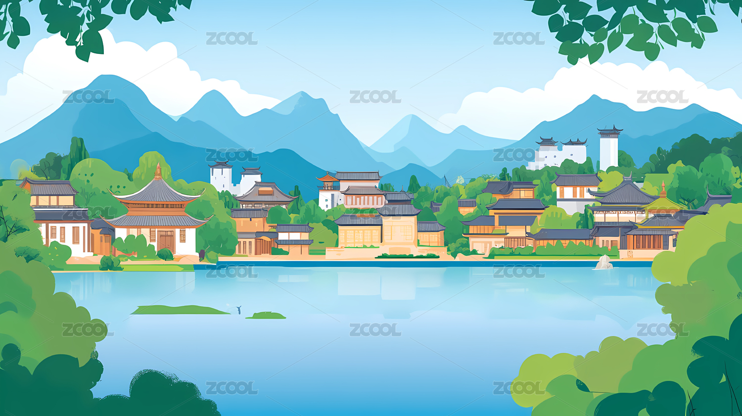 西安大唐芙蓉院夏季荷花柳叶国潮风插画