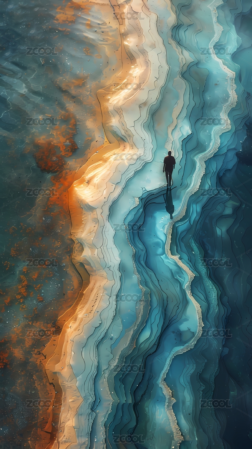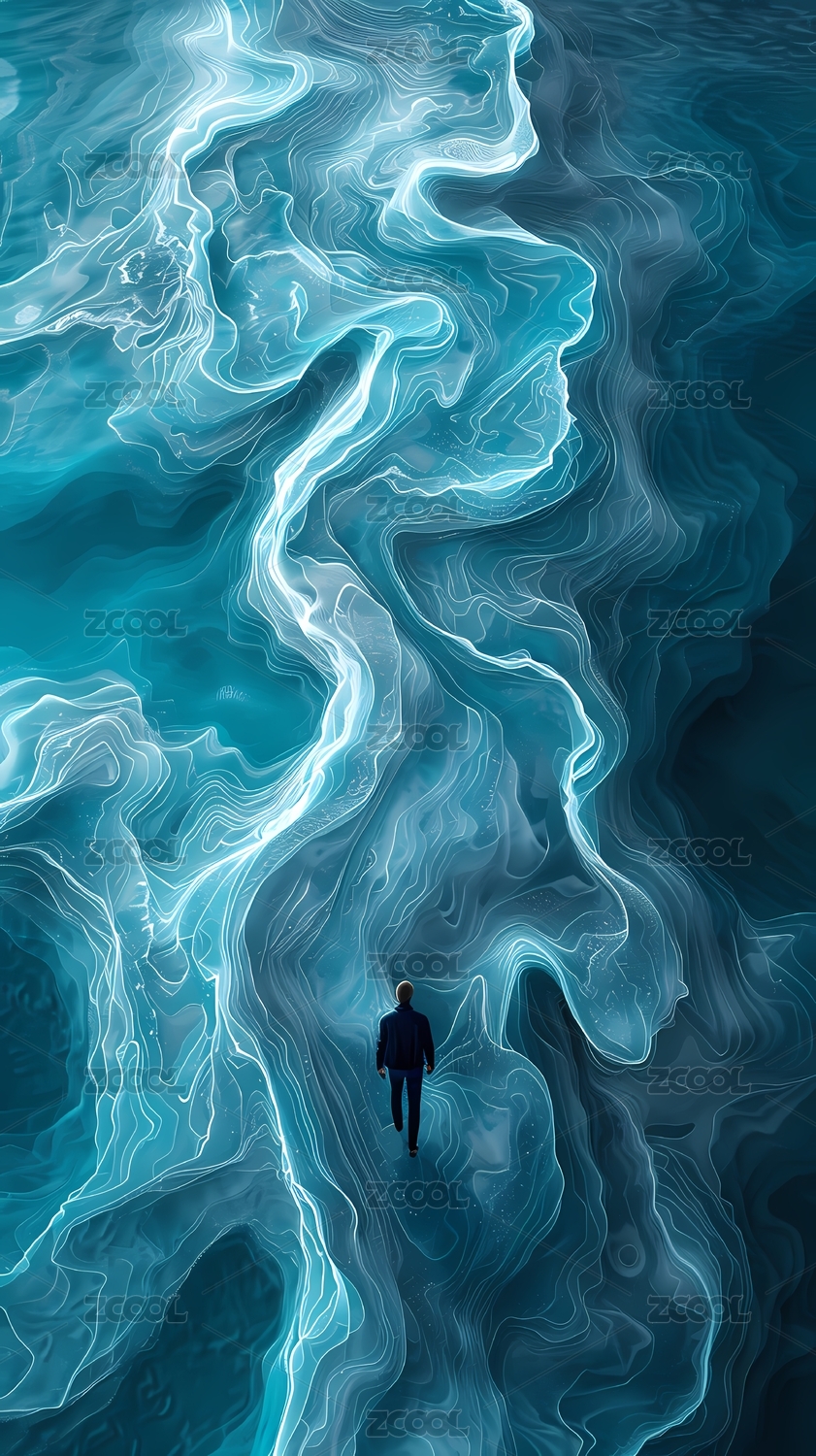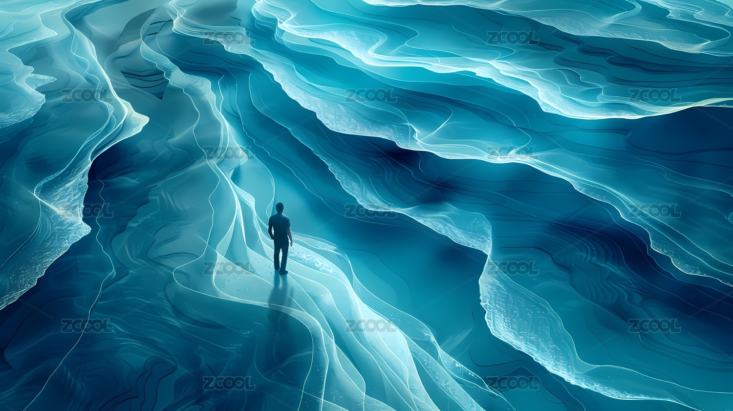蓝色抽象地貌中的人