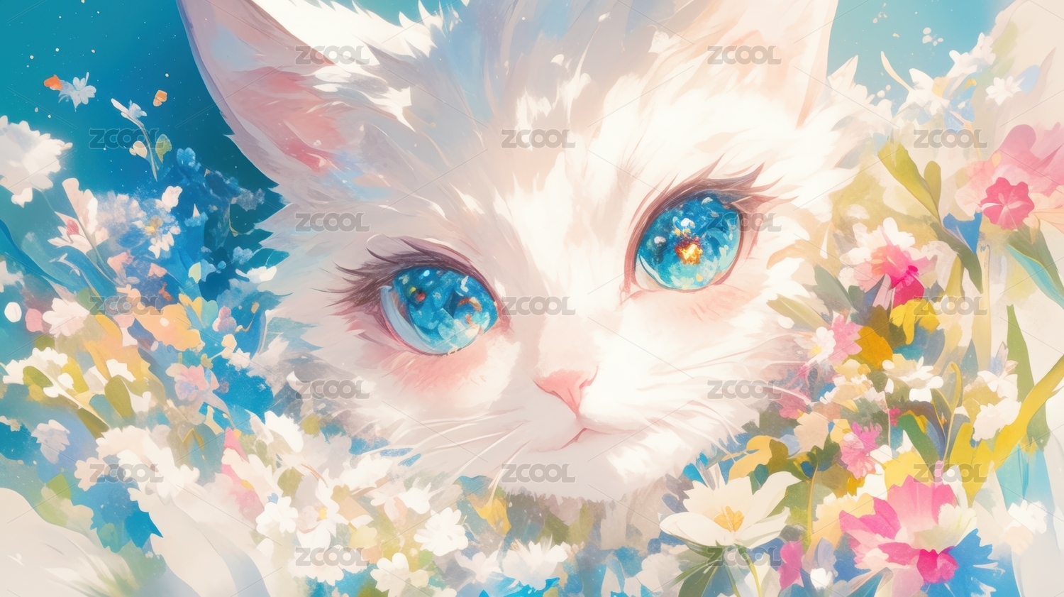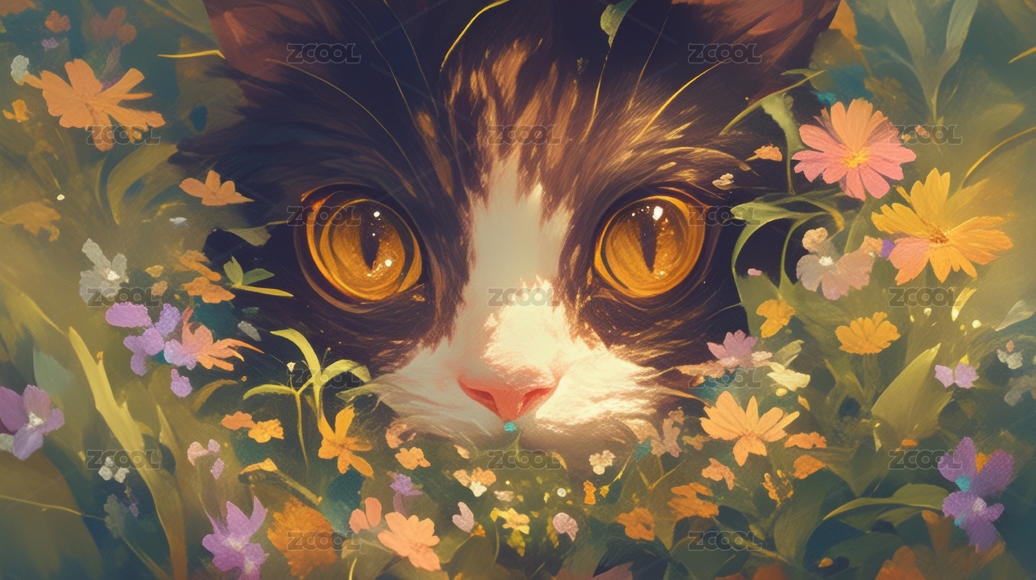 猫,动物,森林,花卉,花朵,自然,复古,水彩,插画,彩色