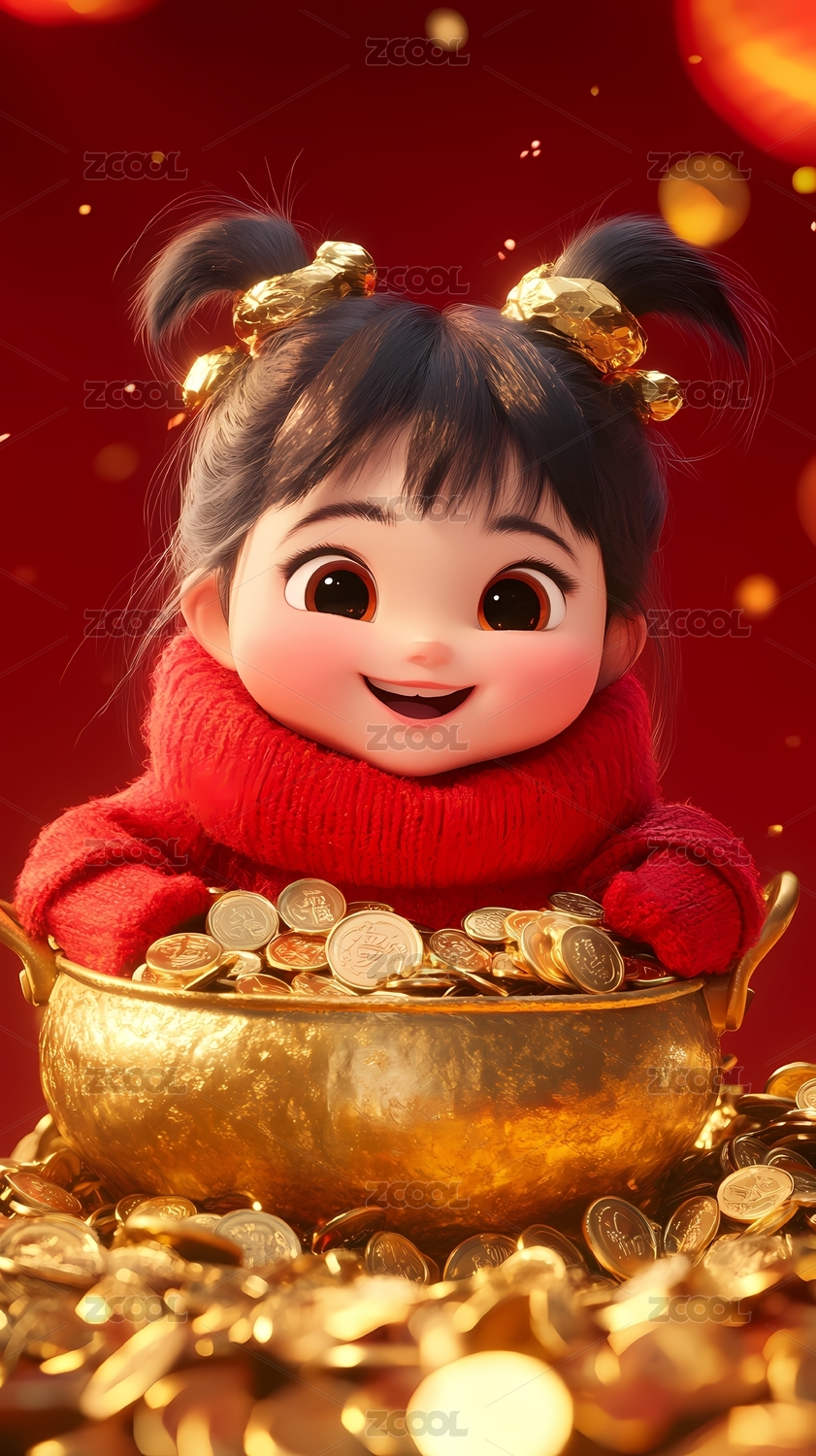 AIGCTP2024,春节,金币,金元宝,可爱,女孩,碗,3d,卡通,金色