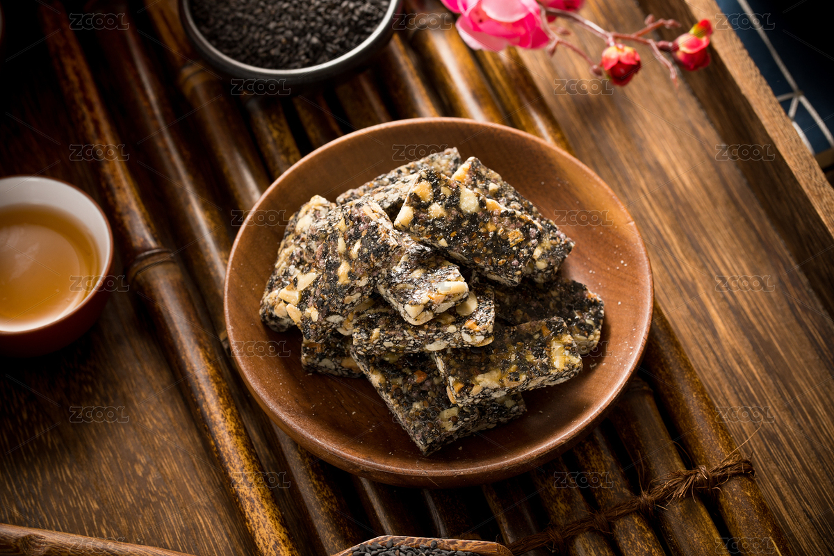 传统中式背景下装在木盘中的点心黑芝麻糖