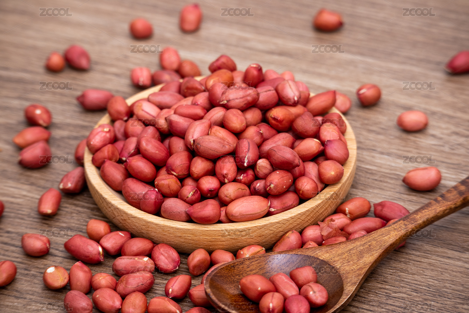 从木勺中散落在木桌上的红皮花生仁俯拍