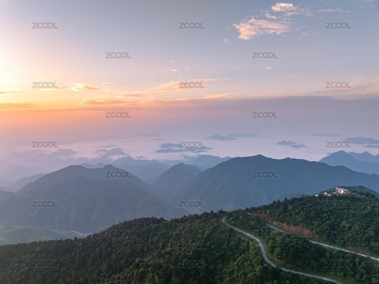夏季重庆黑山谷茫茫群山中日落时分的云雾