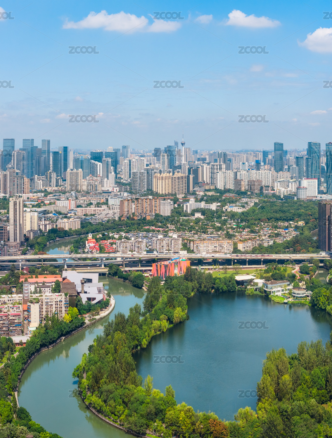中国四川成都东湖公园及市区建筑航拍图