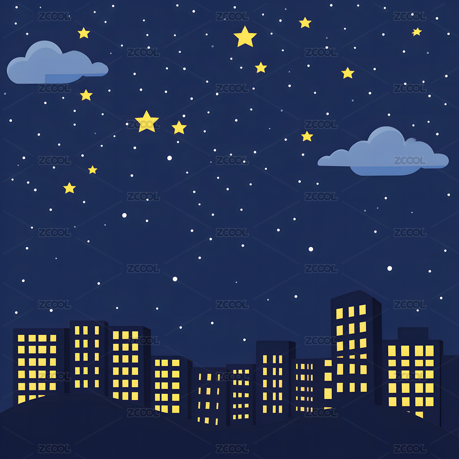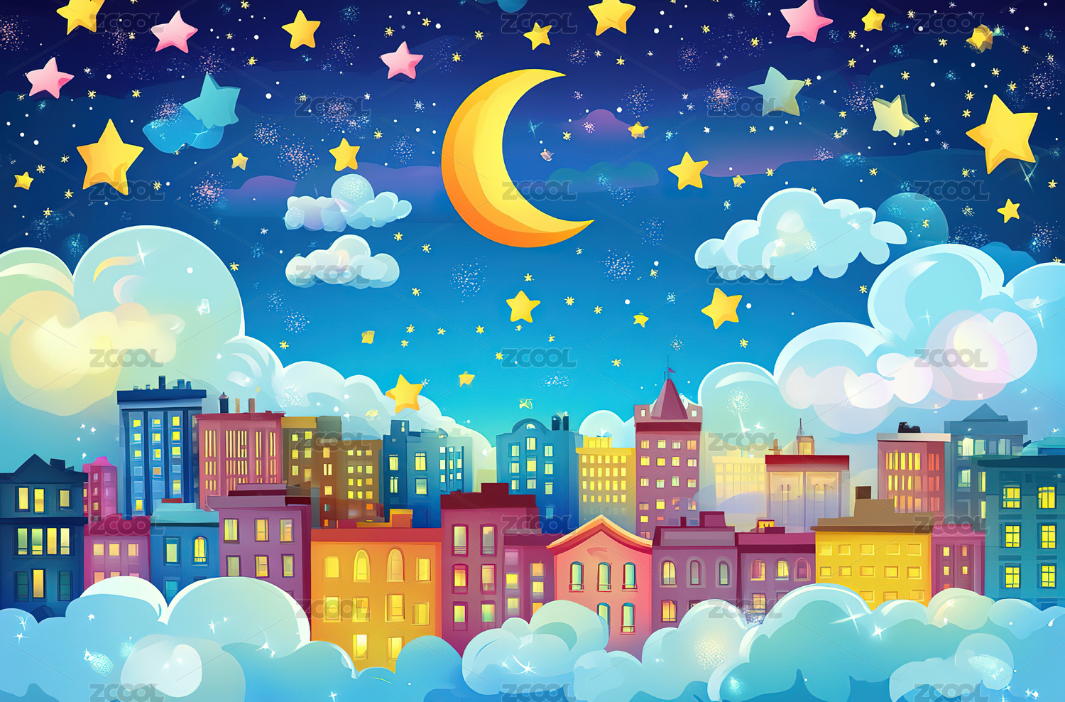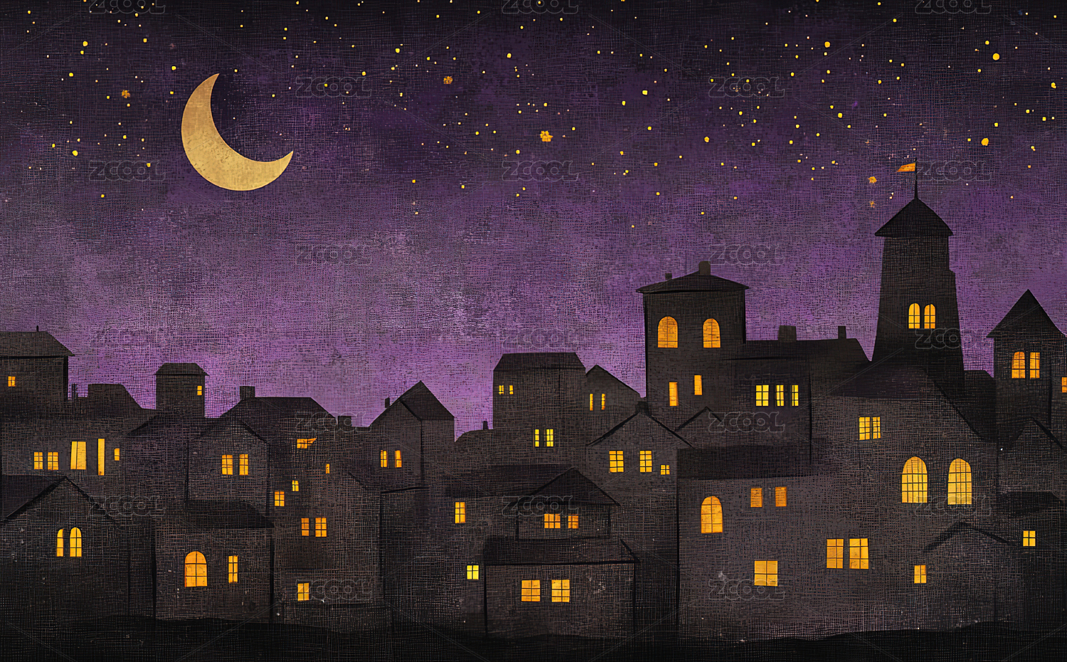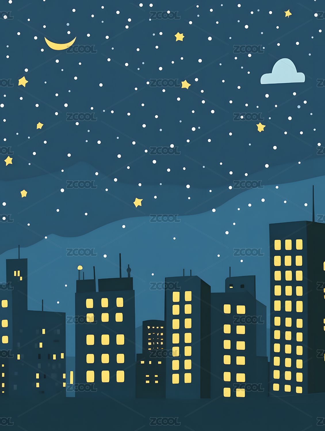 夜空弯弯的月亮在睡觉城市房子窗户透出灯光