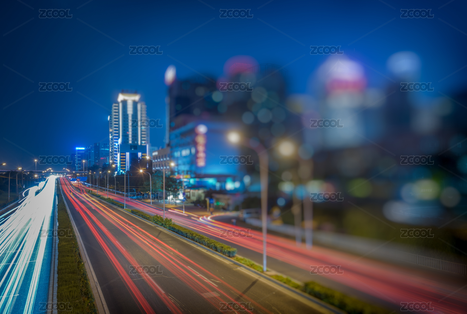 道路交通模糊步道灯,晚上在中国。
