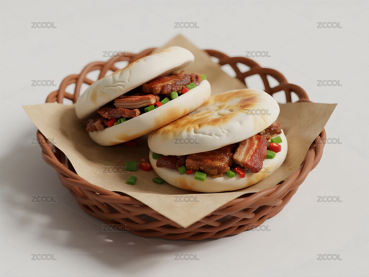 馍夹肉食置于竹篮之中