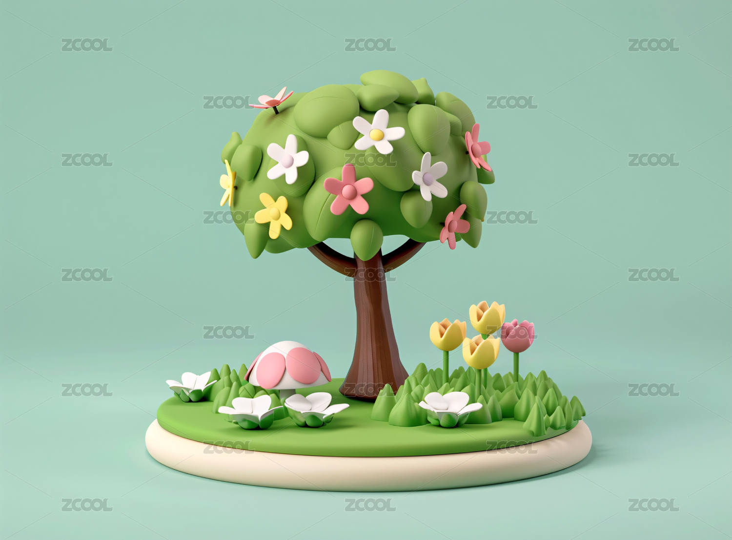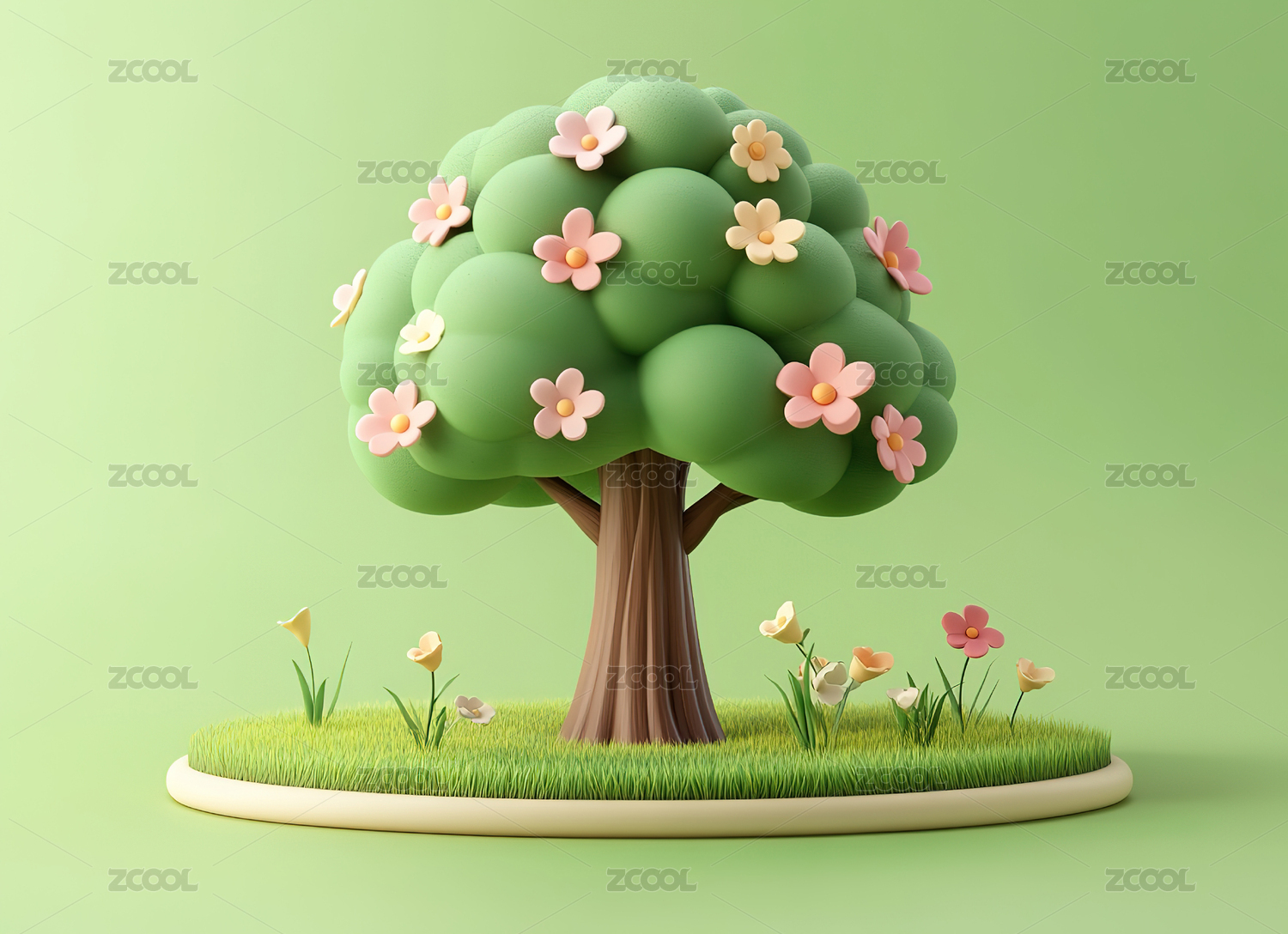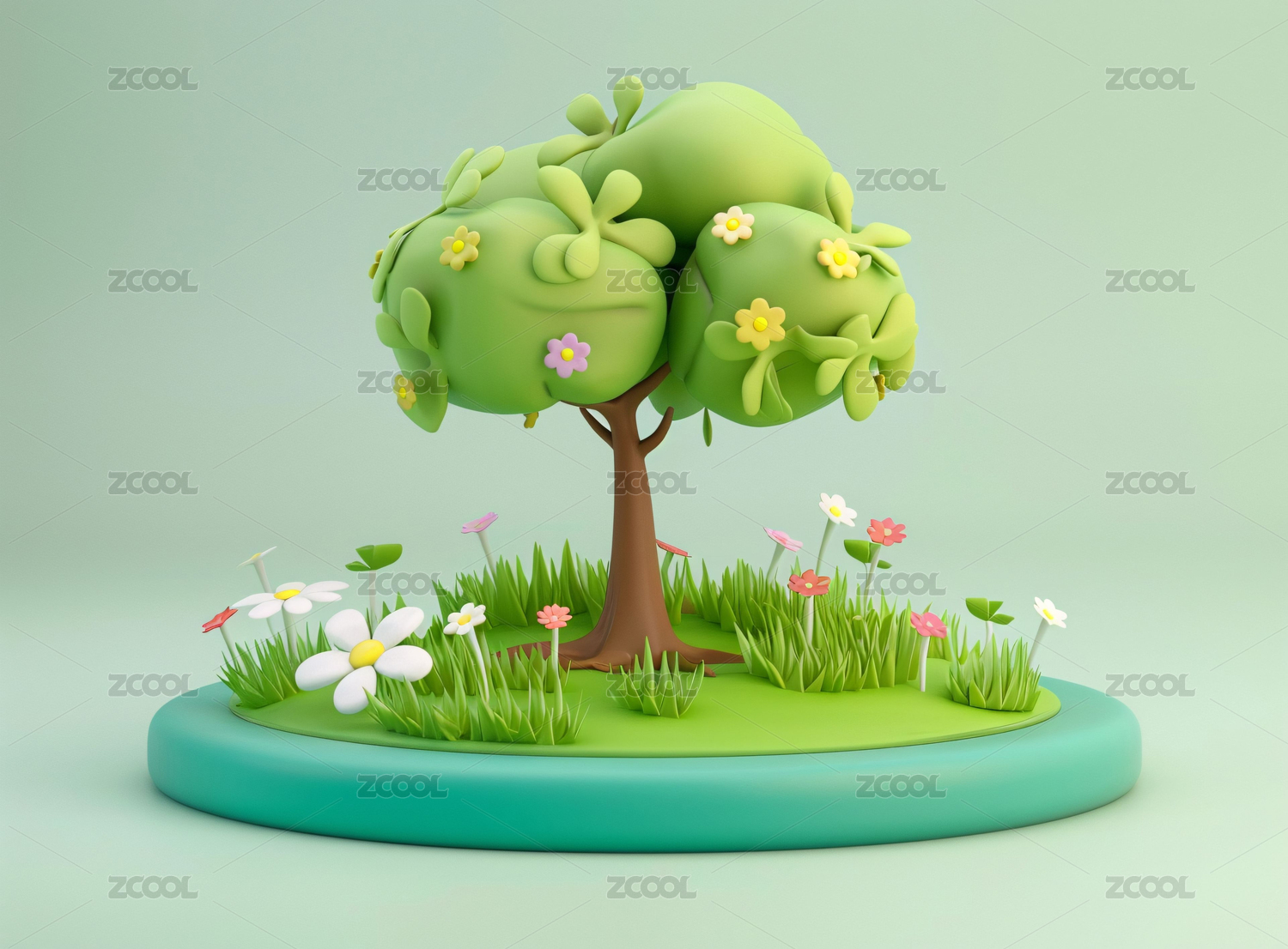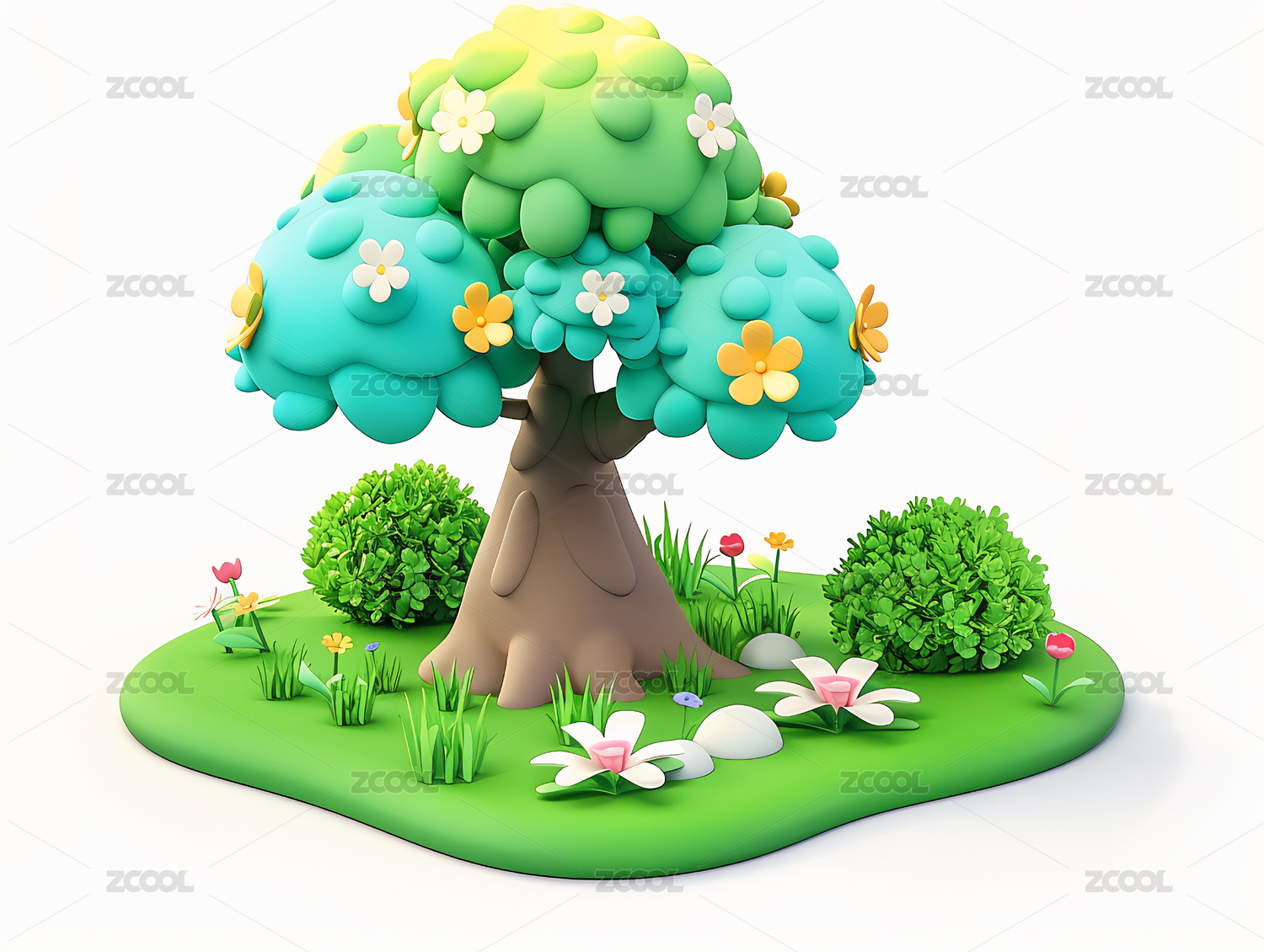 可爱风春天卡通3D绿色树木花朵元素