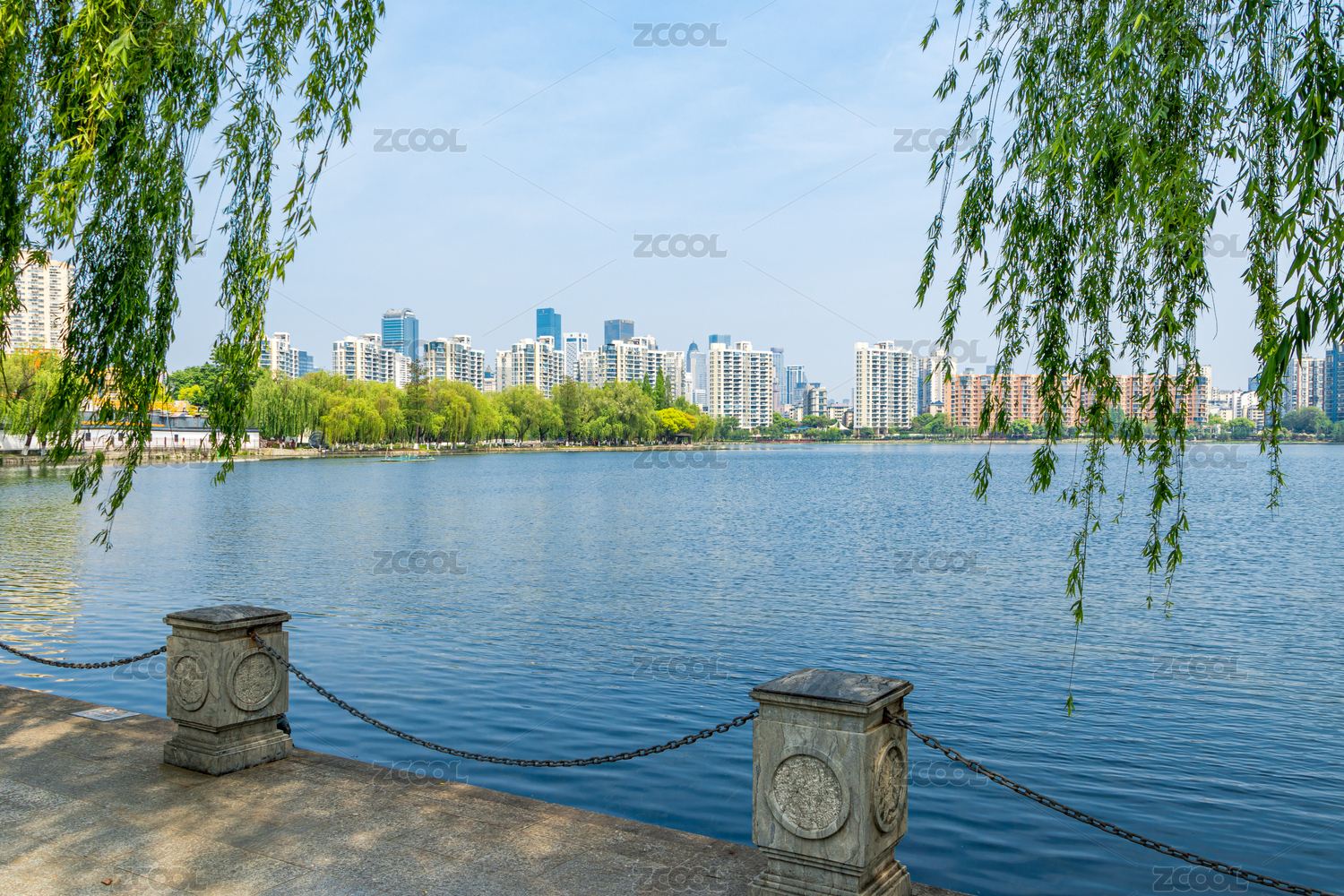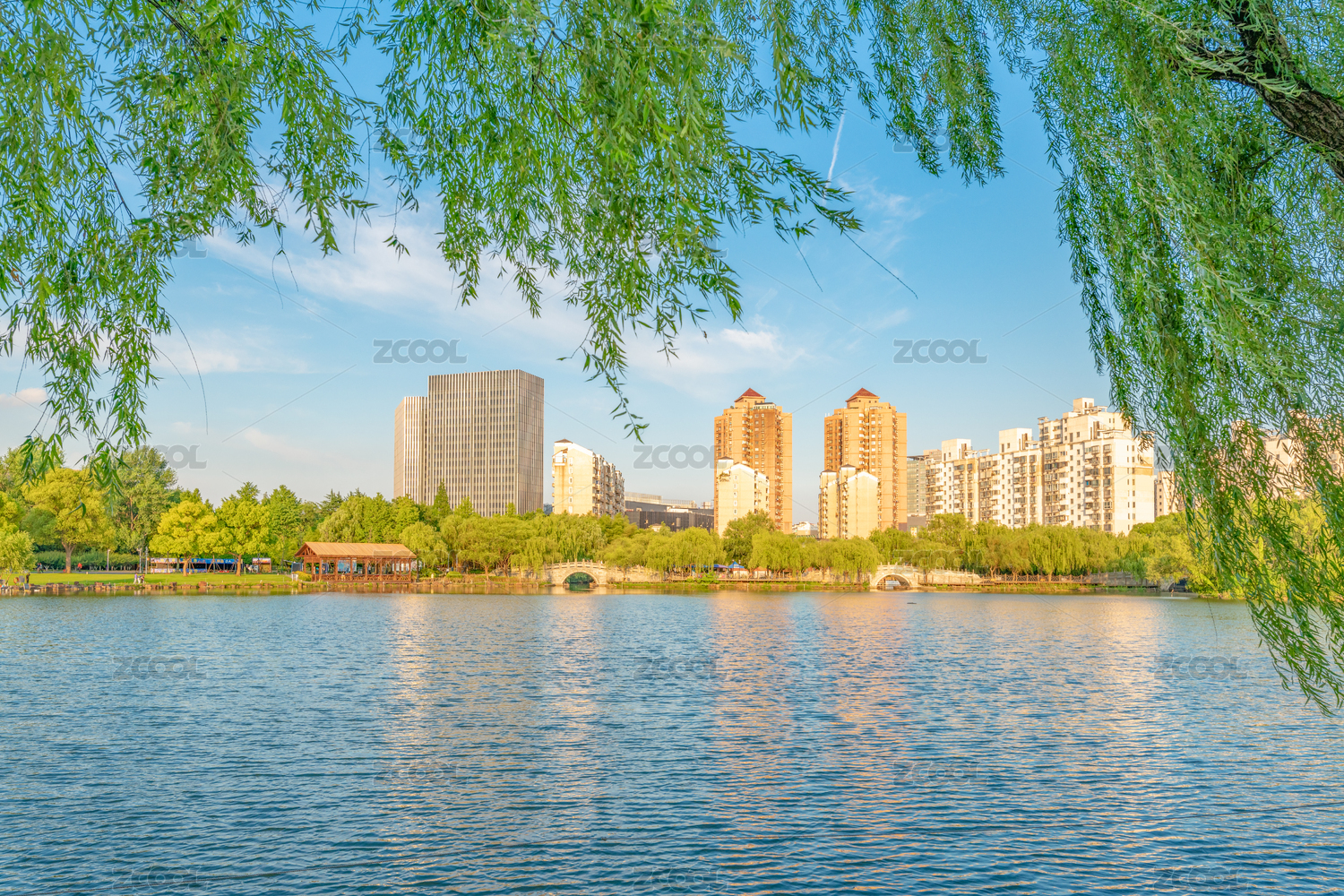 下午垂柳下的湖滨风光,中国上海市静安区大宁郁金香公园