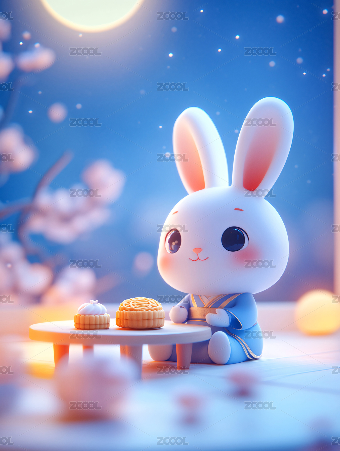 中秋月夜下的可爱兔子与月饼
