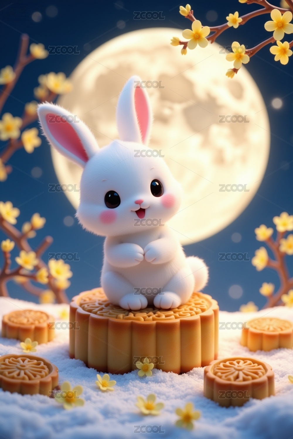 AIGC202403,玉兔,月亮,月饼,兔子,兔,插画,卡通,节日,圆月
