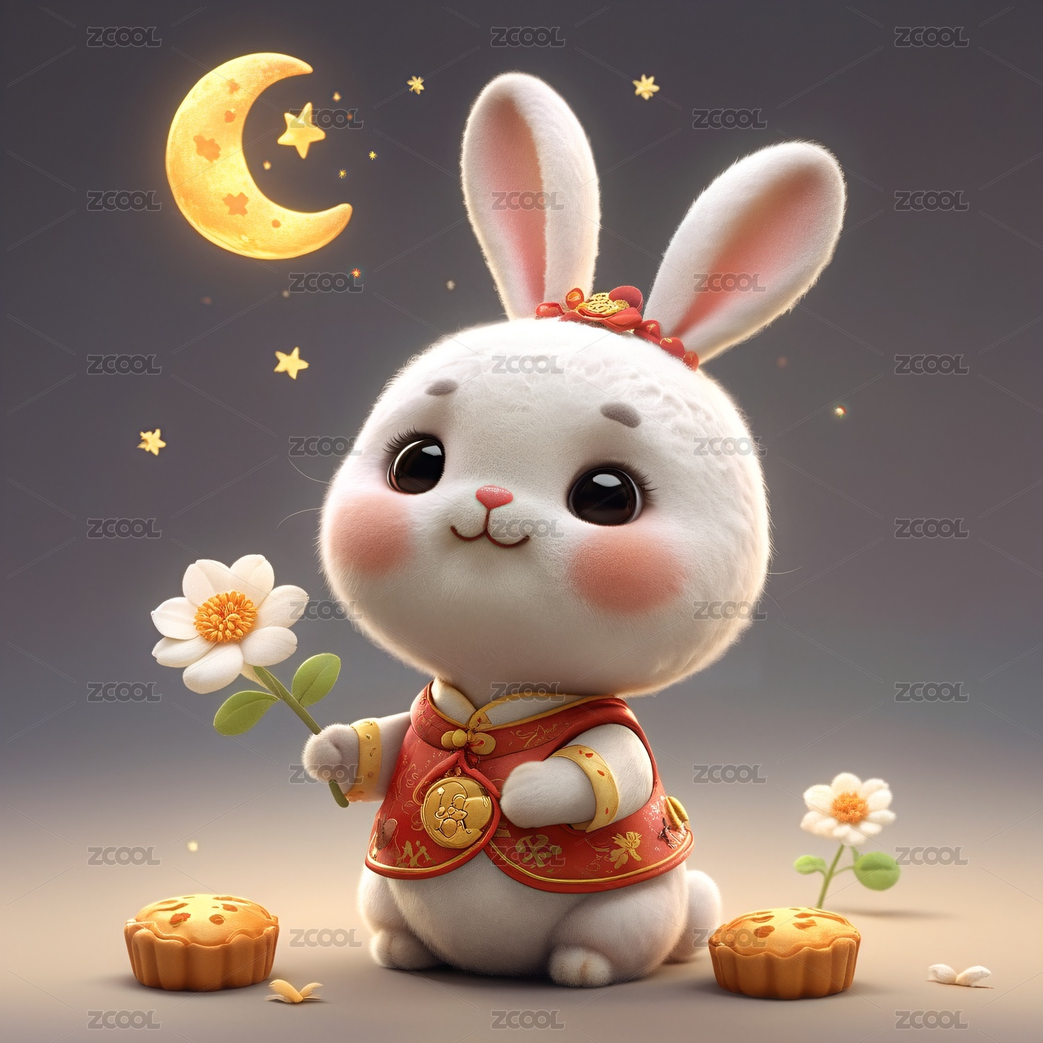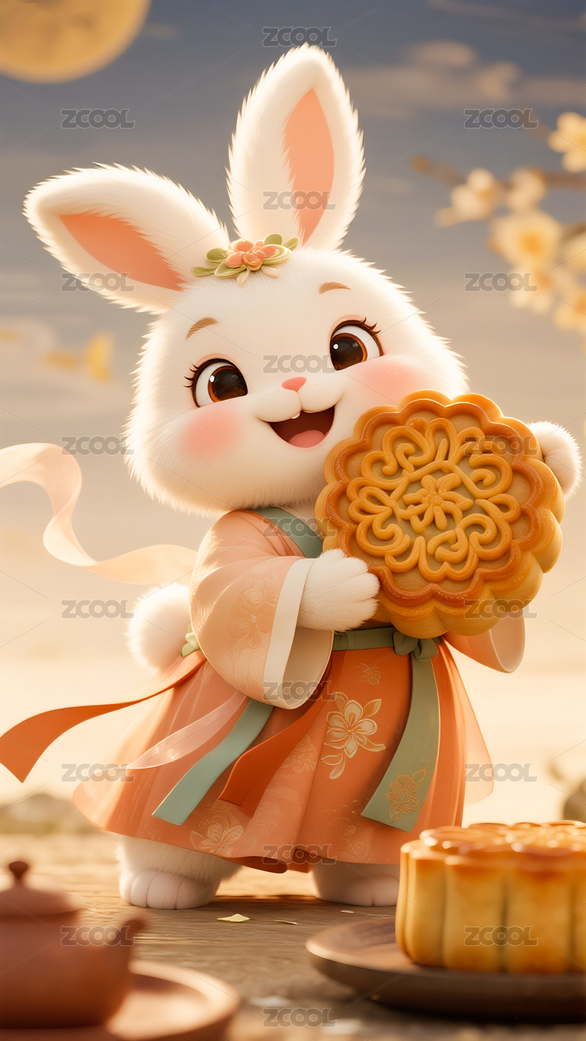 拿着月饼穿着汉服头戴花的小白兔