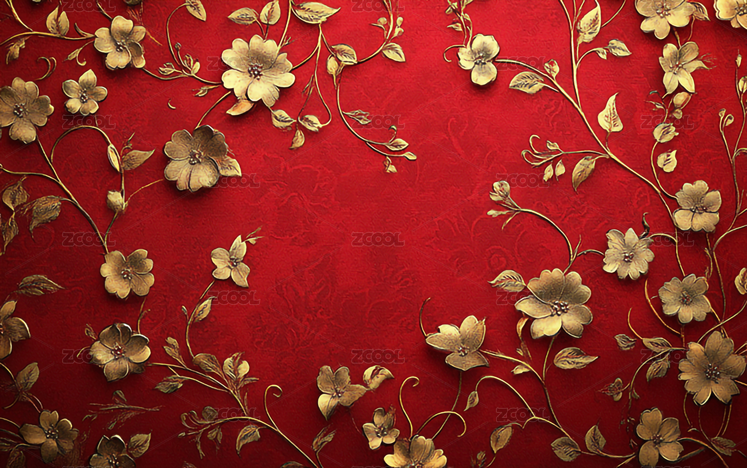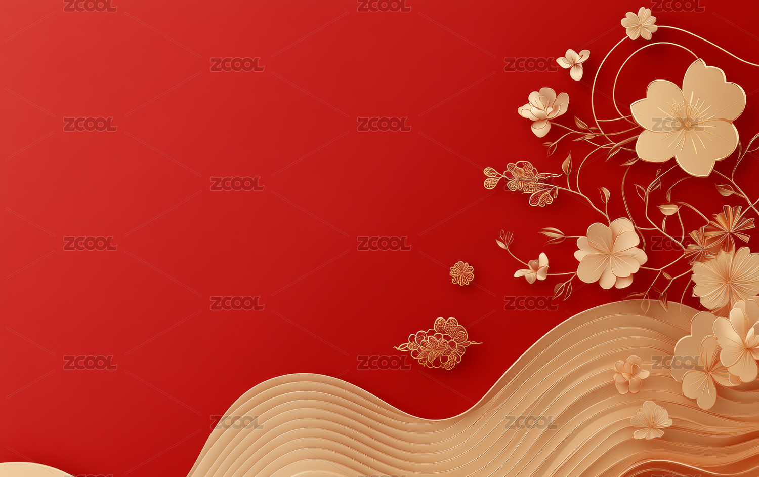 红色背景下,金色元宝和装饰灯笼的节日景象