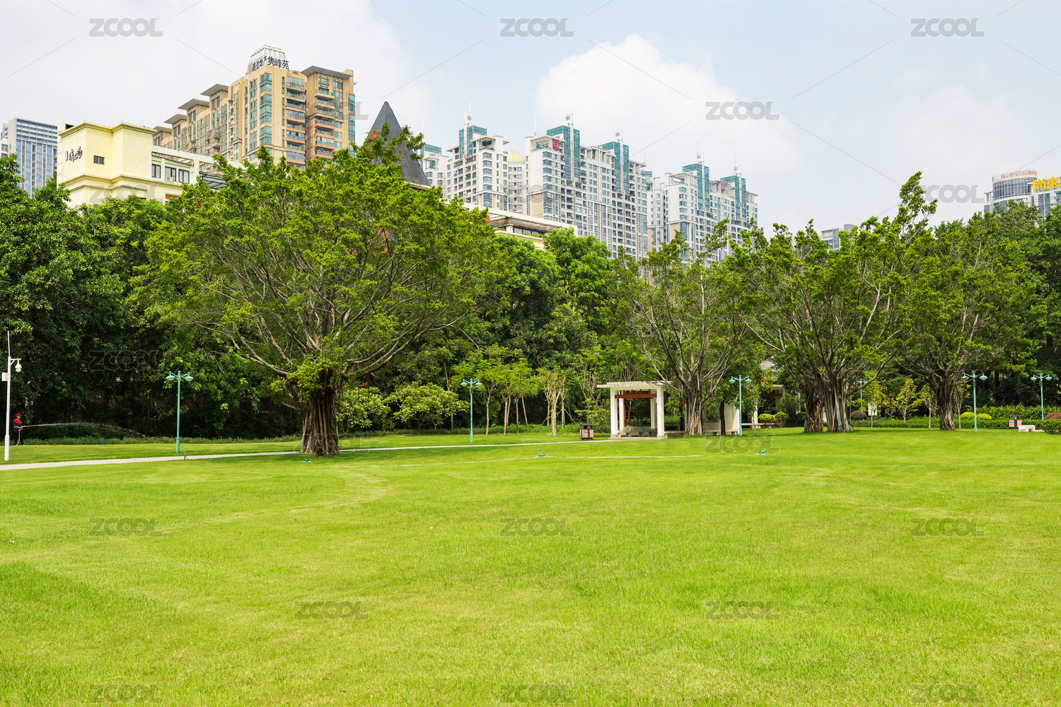 广州珠江公园绿色草坪树林与城市高楼建筑