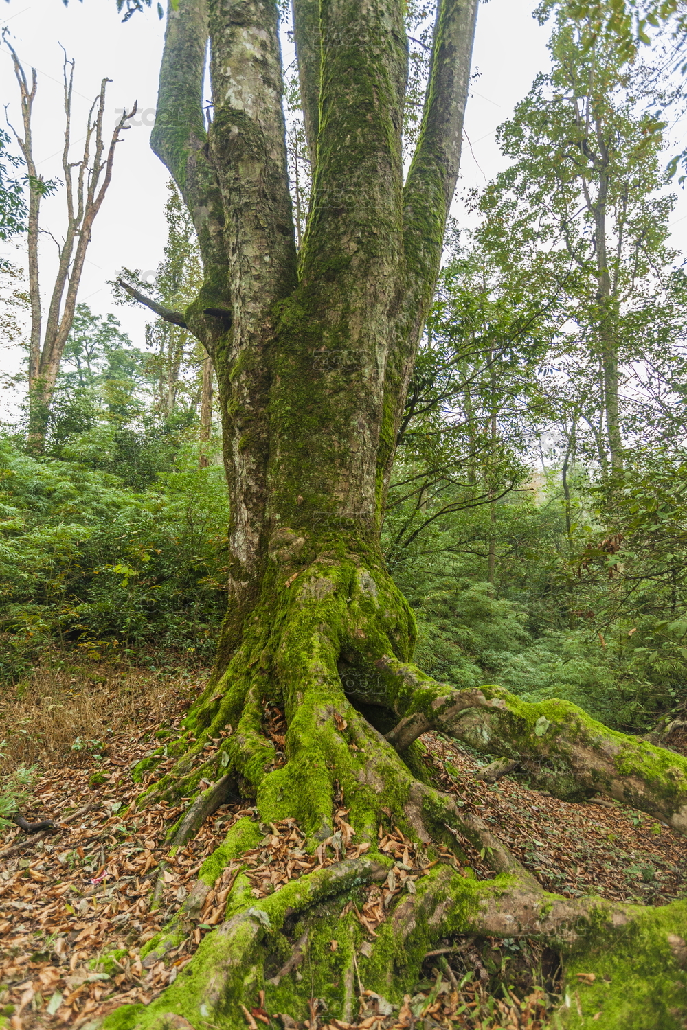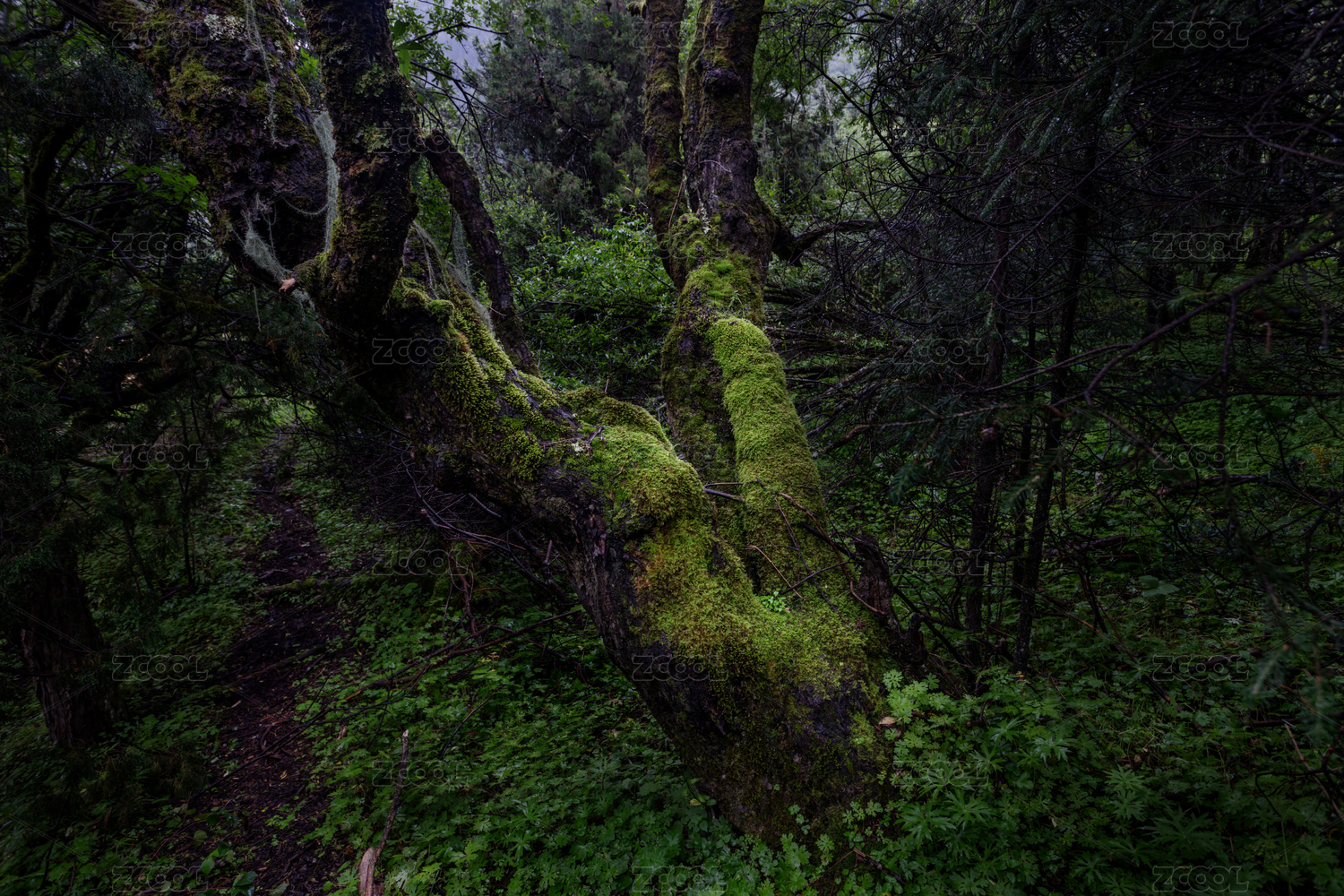 高原原始森林里长满苔藓的大树