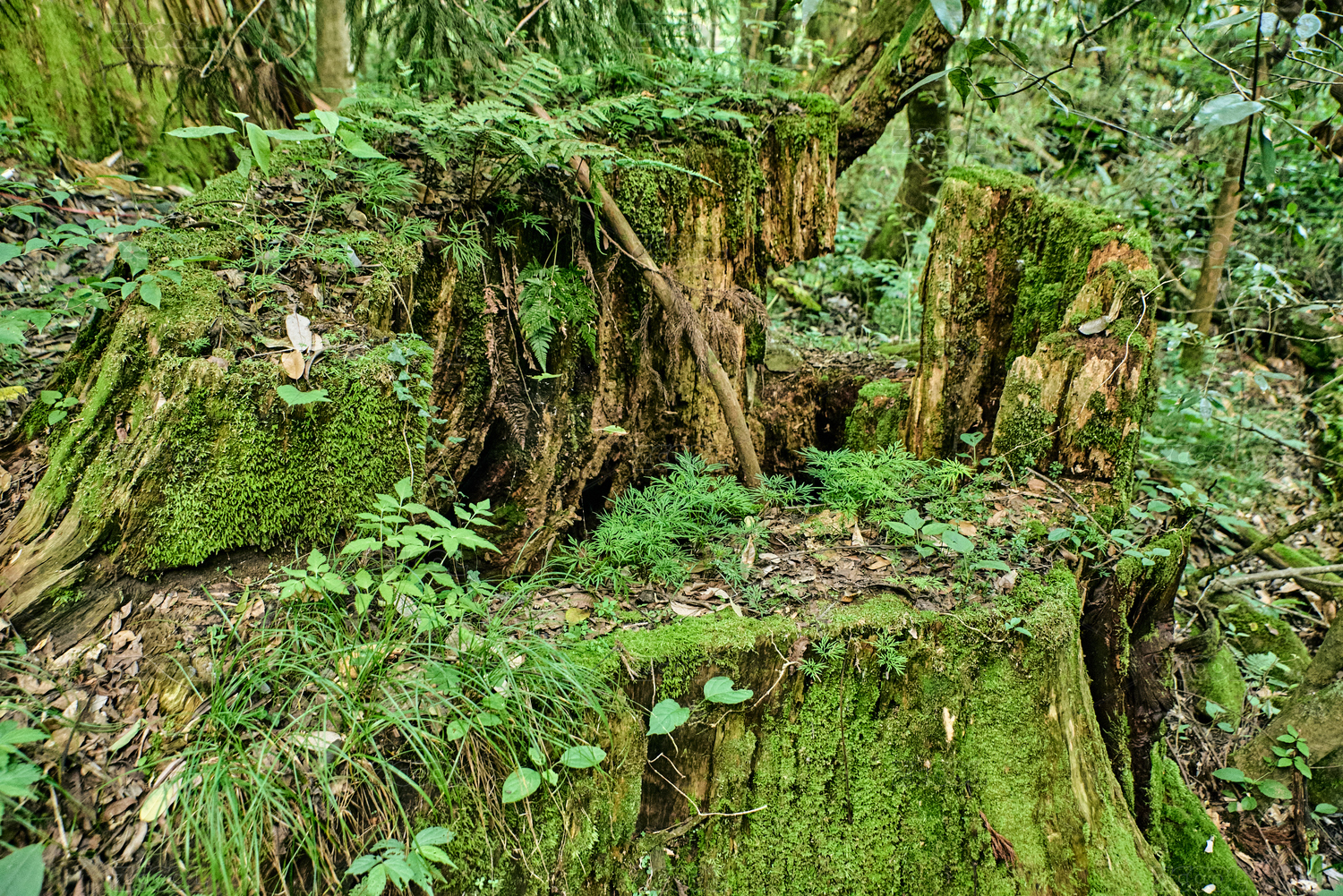 自然保护区原始森林中的枯树树根