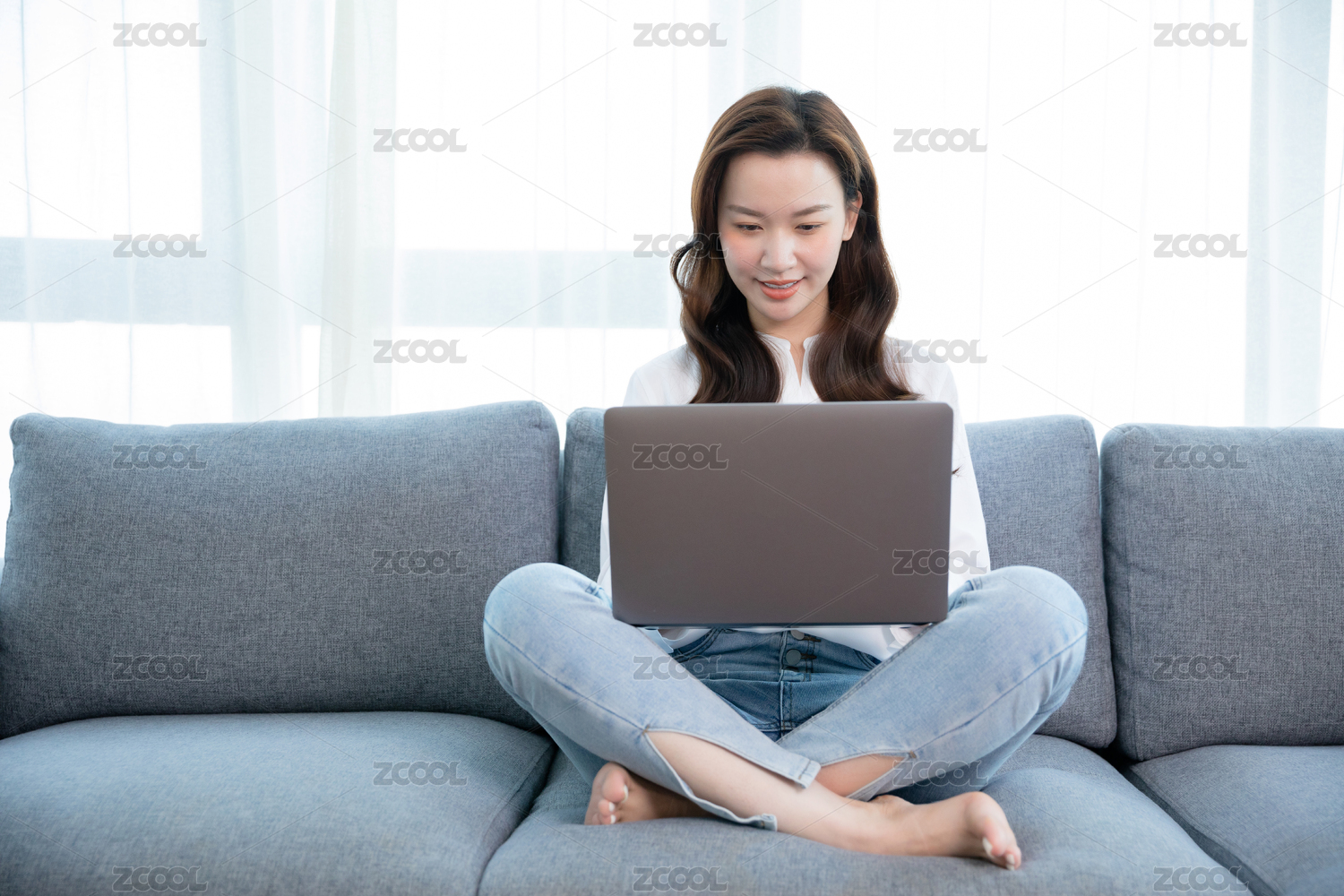一名年轻的亚洲女子坐在客厅的沙发上使用电脑
