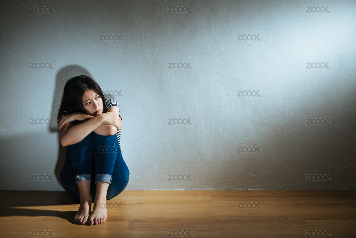 悲伤的年轻女子坐在木地板在看空的暗区感到不快,并害怕与受虐受虐妇女观白色墙壁背景。
