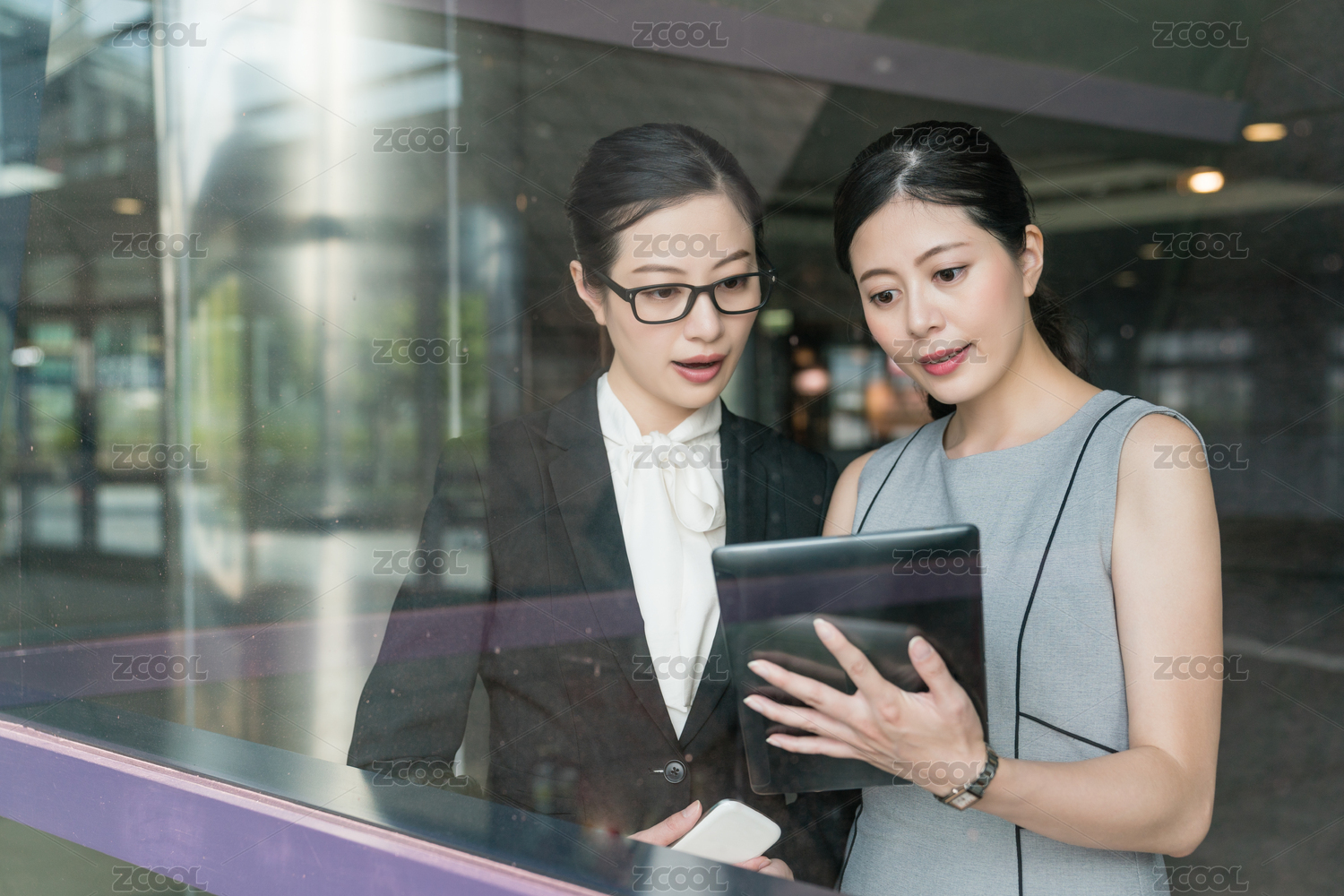 2名迷人的亚洲女性经理谈论使用计算机数字平板电脑的新项目,从窗口外的劲射通过。
