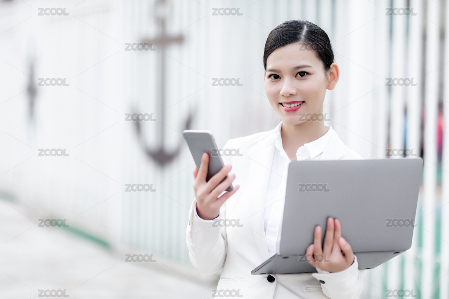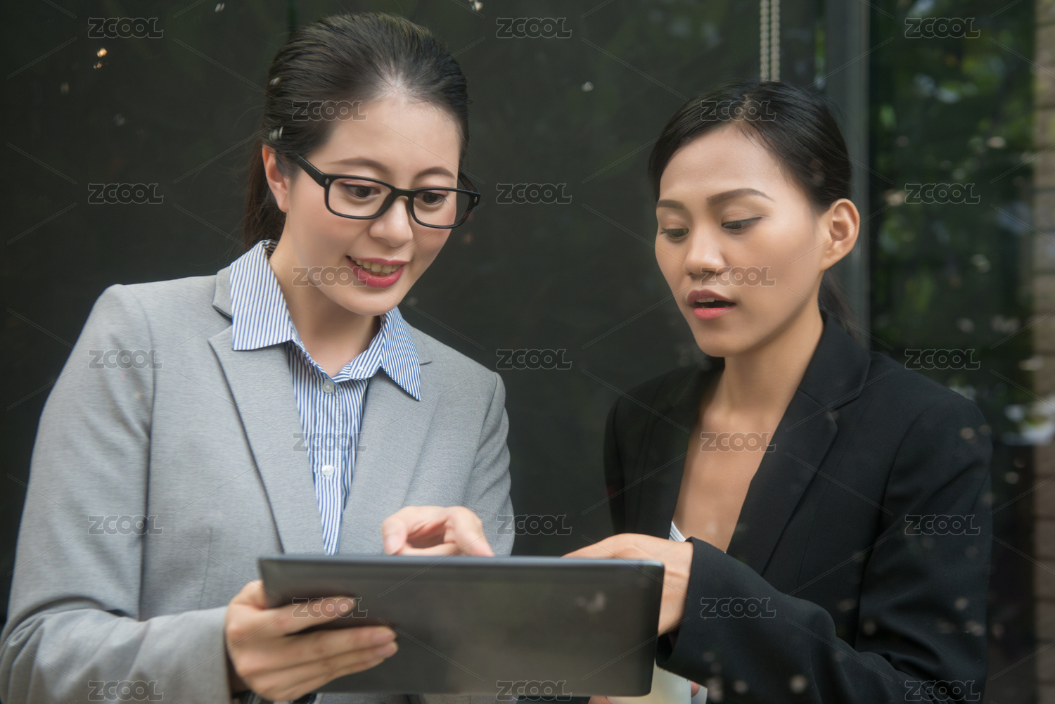 两个亚洲办公室女郎利用高铁站外的平板洽谈业务。