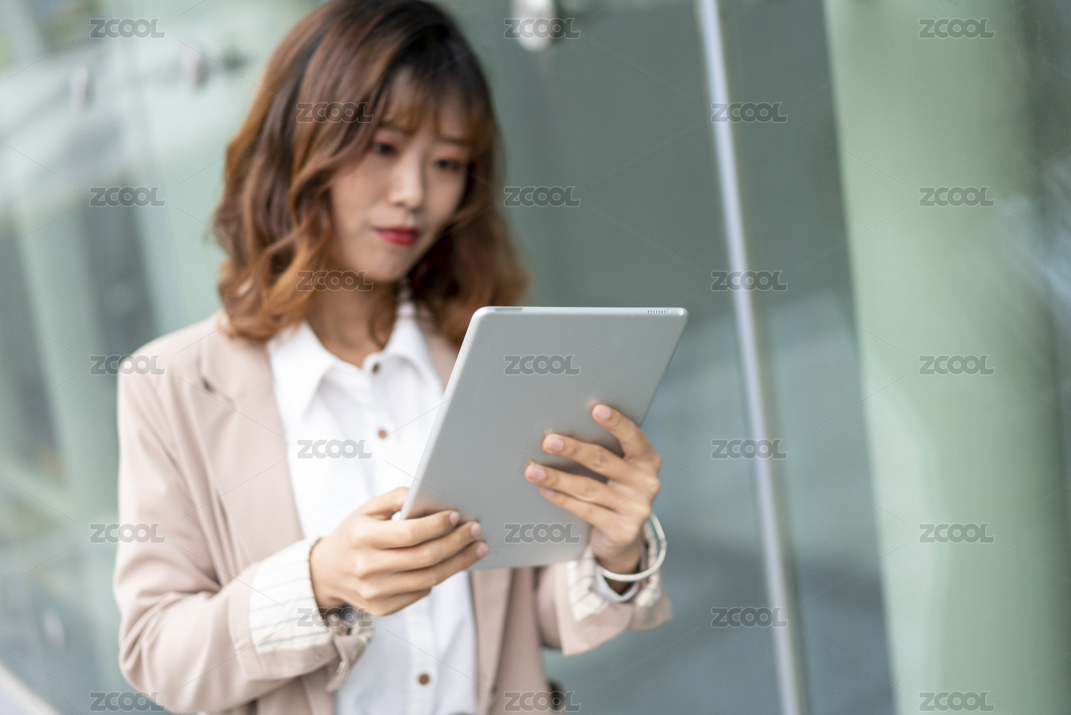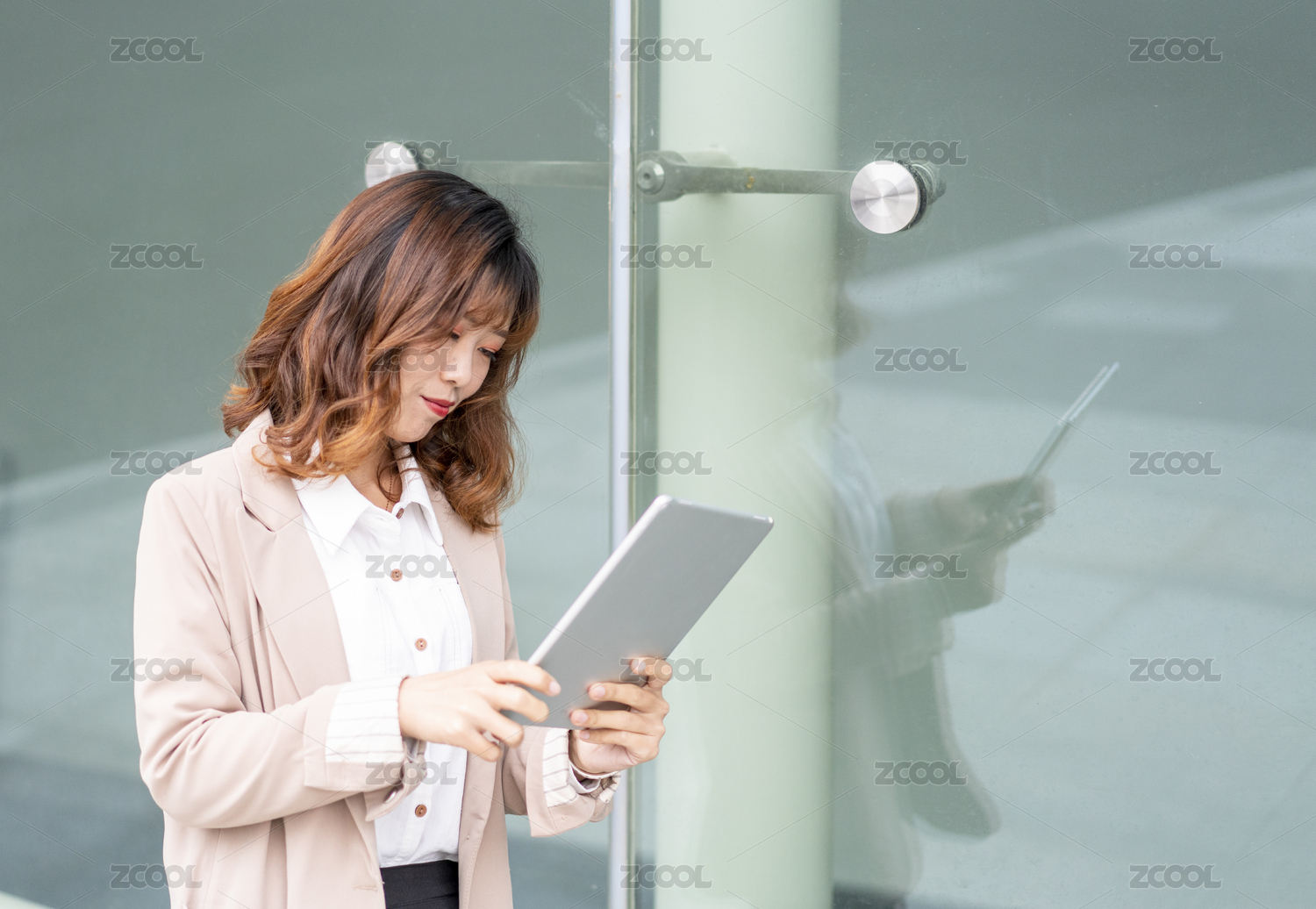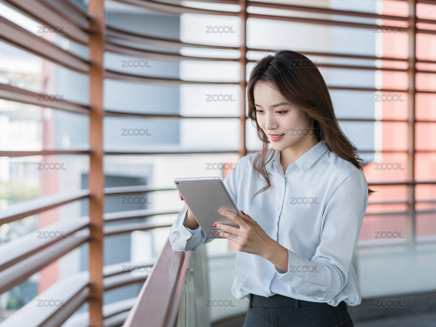 两个办公小姐从窗口往外看。其中一人拿在手中的平板电脑。
