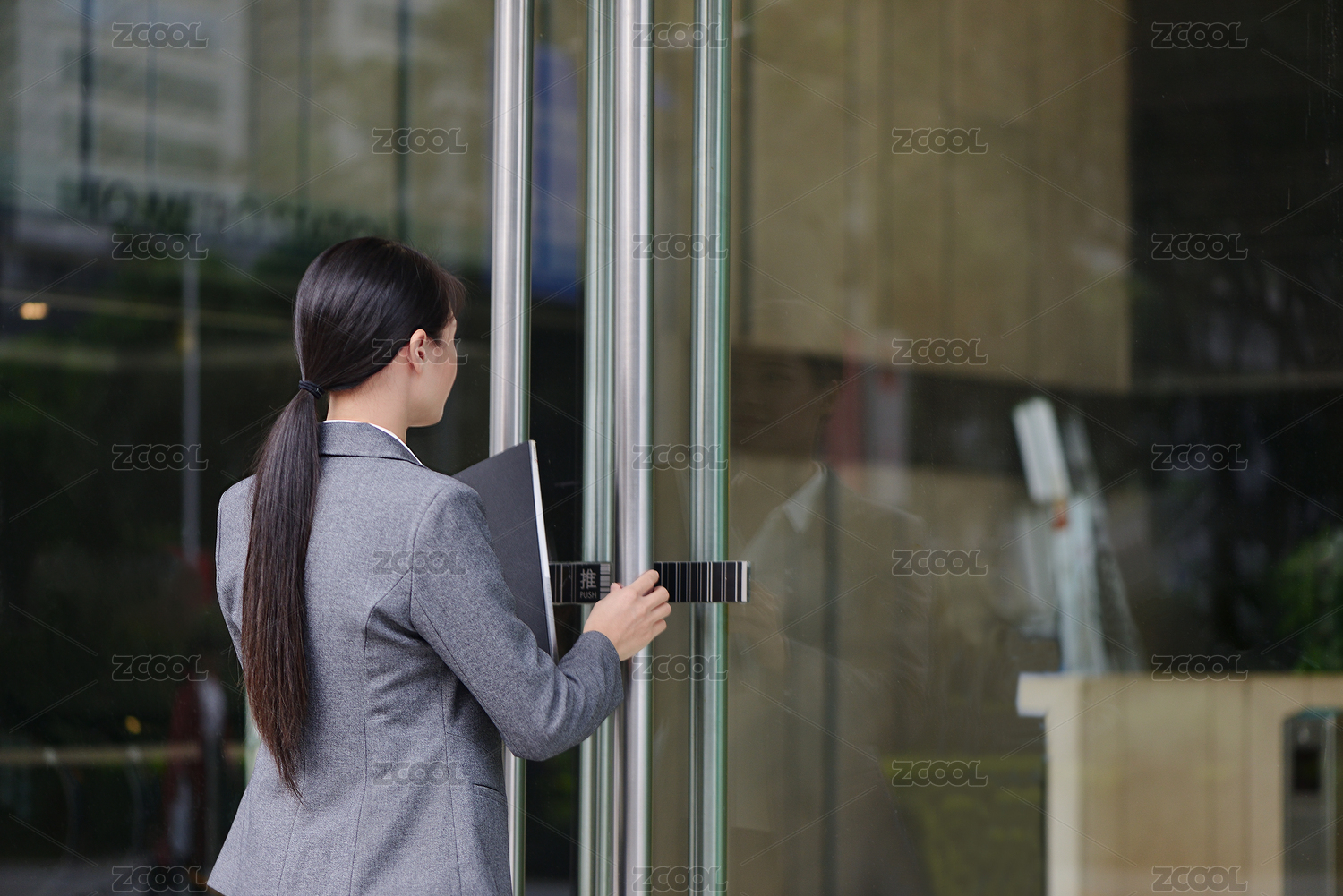 展示他们的产品,以客户袖手旁观玻璃门亚洲主管。采用现代先进的公司内部的平板电脑。