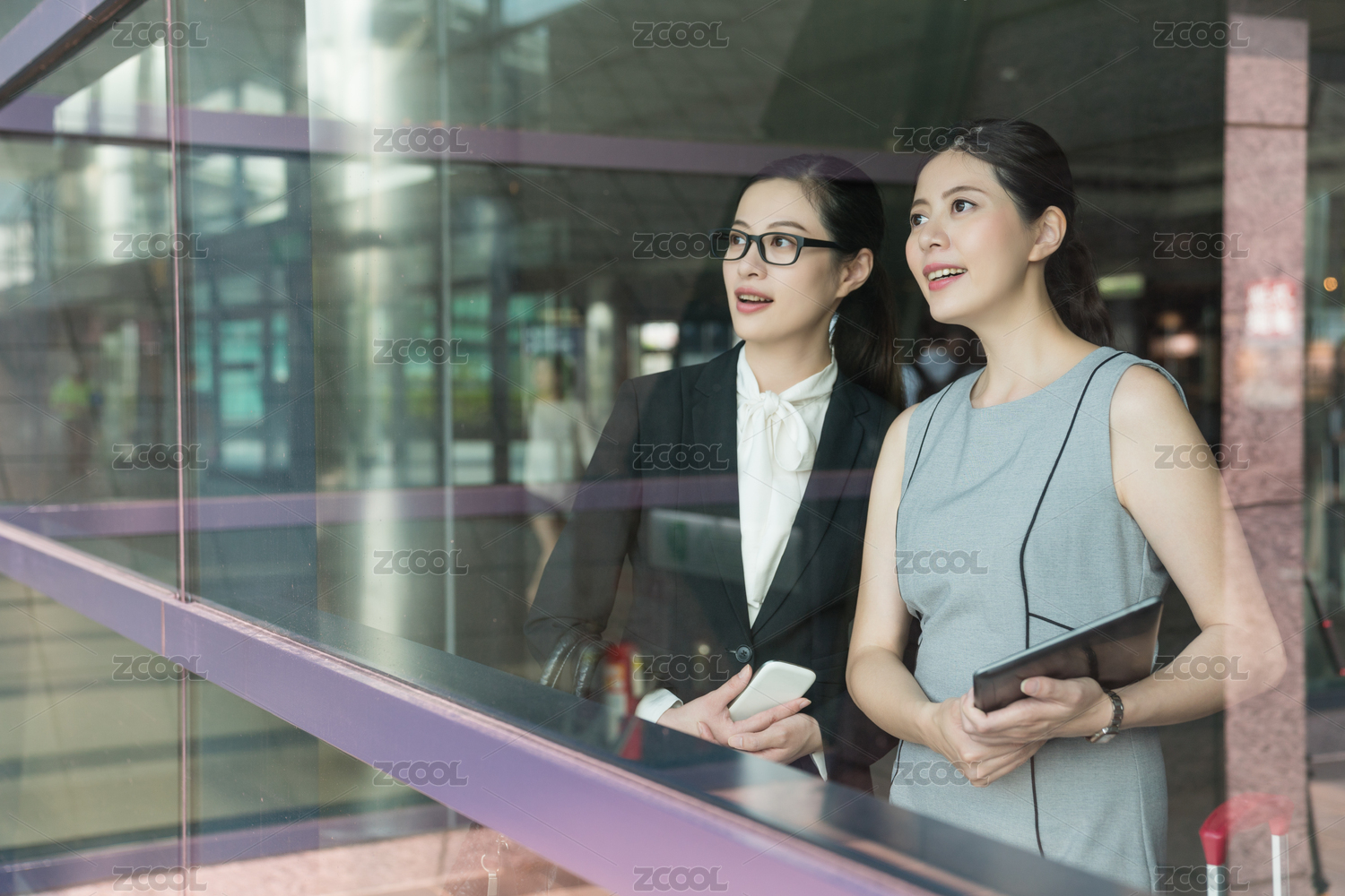 亚洲女士在正式的西装讨论业务穿着。他们看到了希望和期待着窗外的项目。