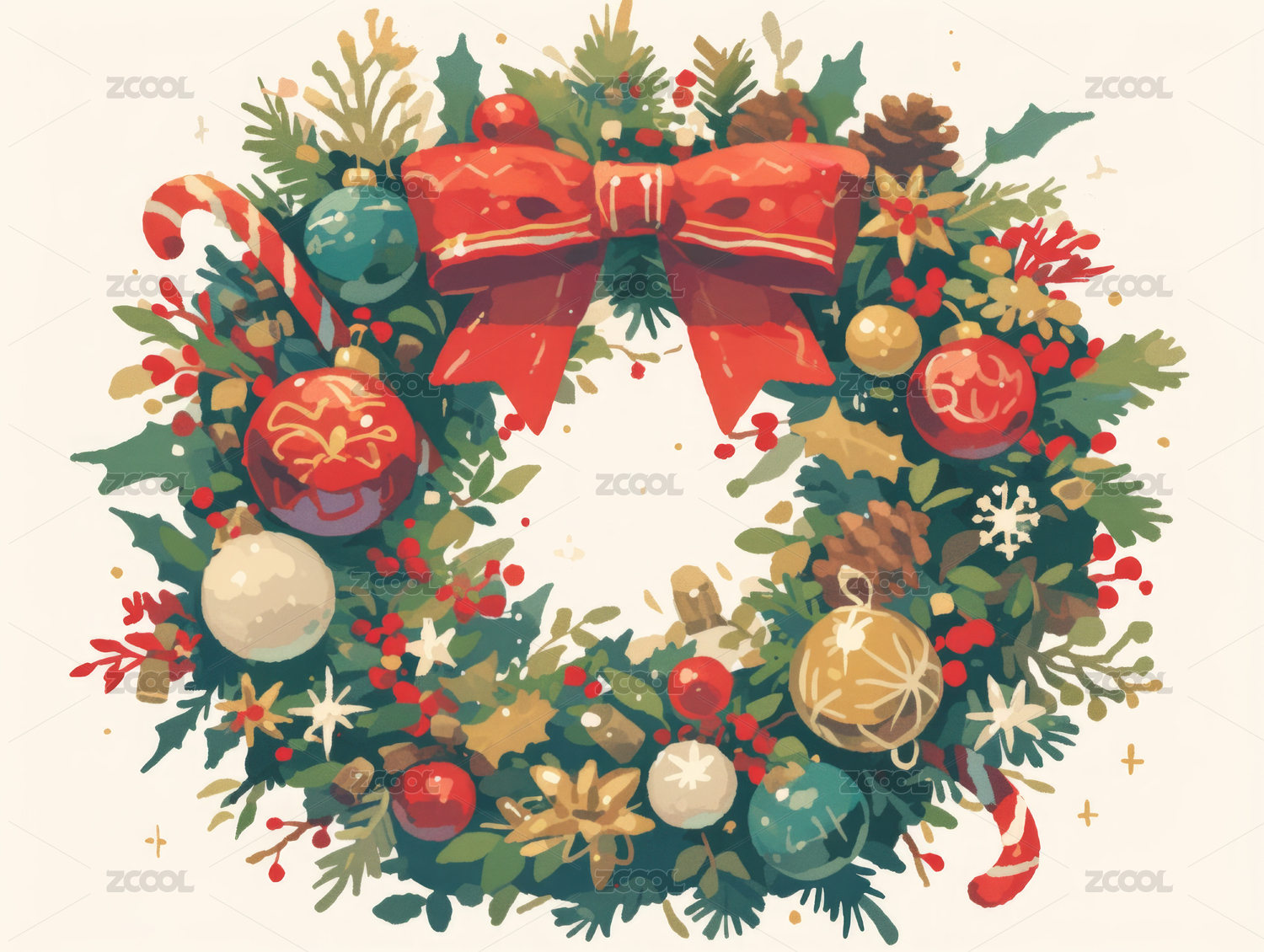 白底鲜花绸带松柏冬青枝的圣诞节花环插画