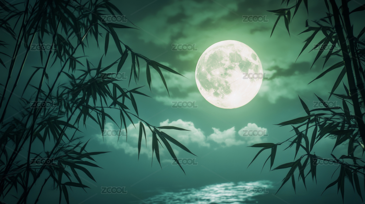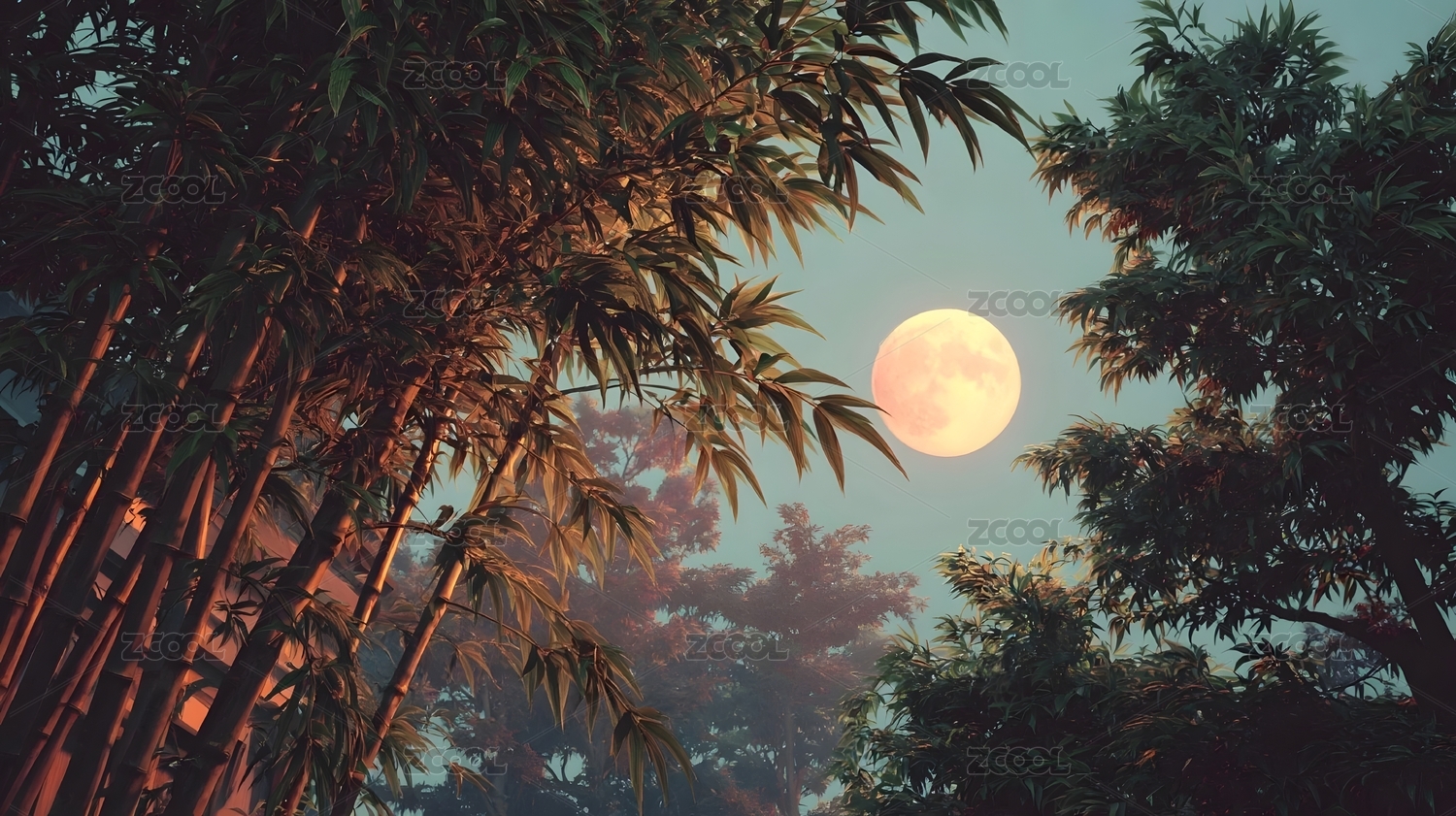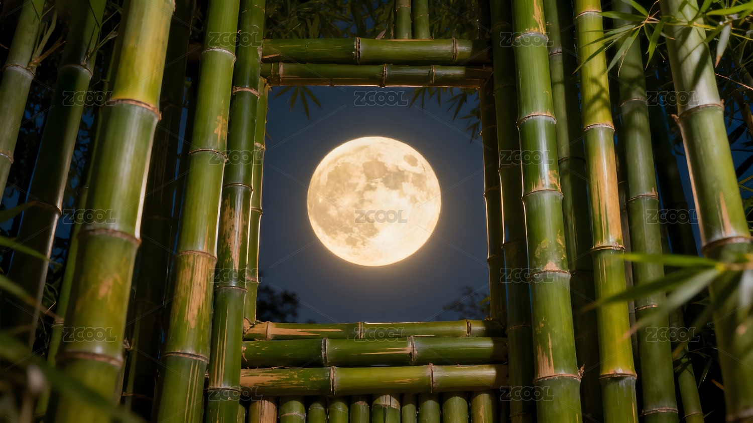 竹林月夜满月高悬如画框