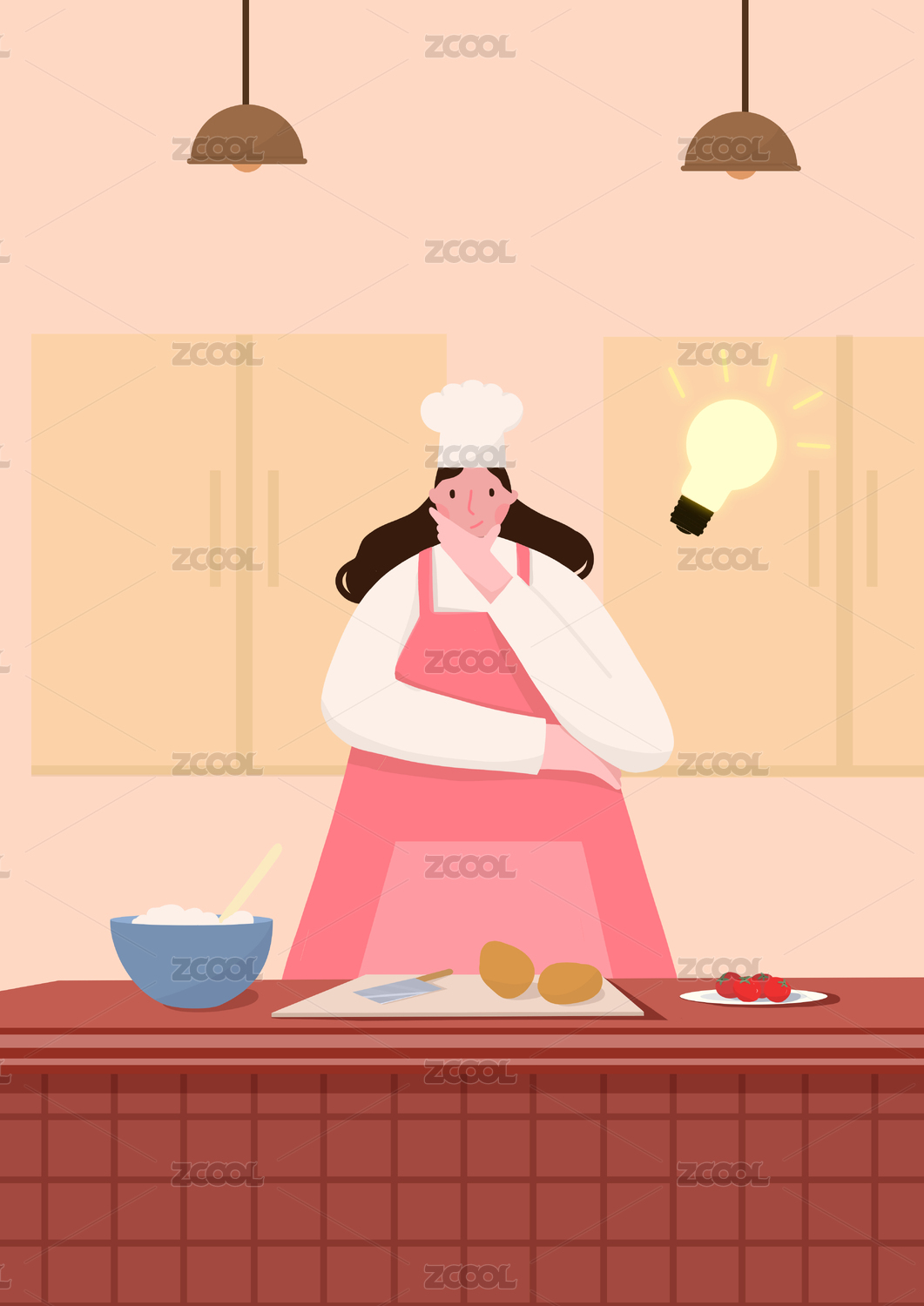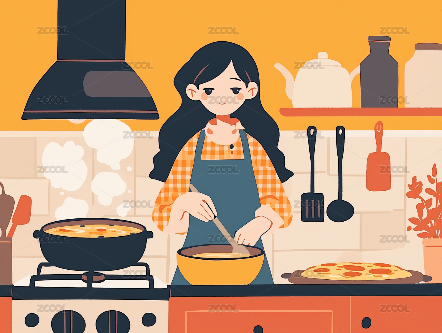 卡通可爱女生厨房做饭美食清新文艺插画