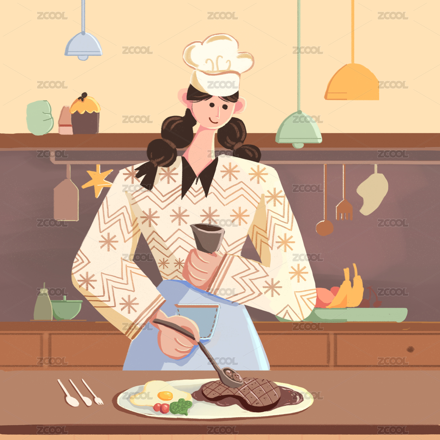 卡通可爱女生厨房烧制美食清新插画