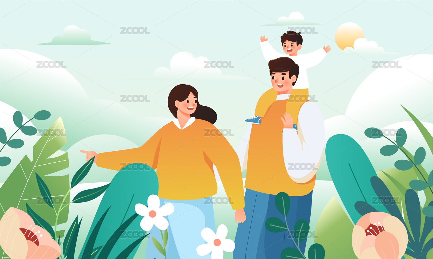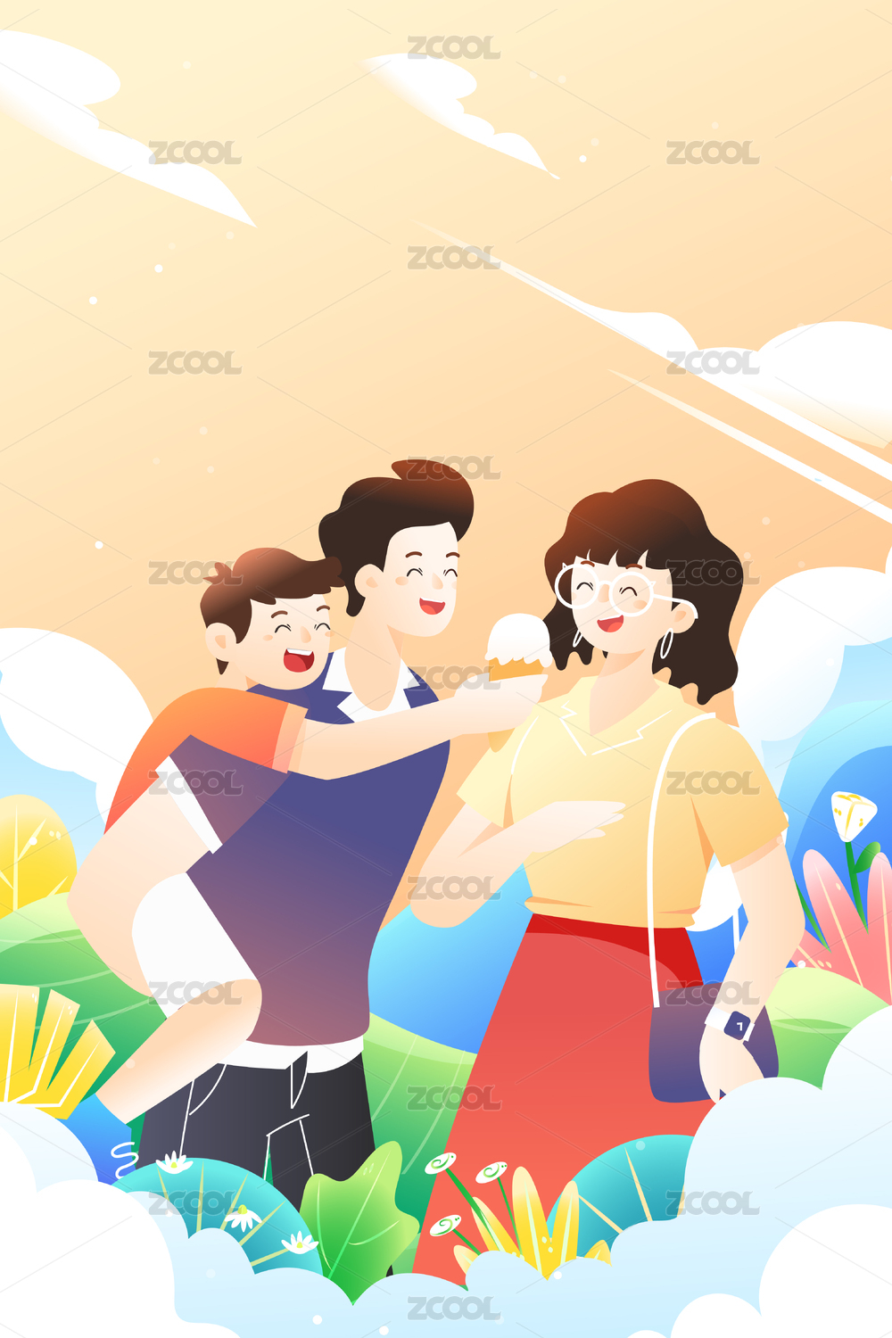 一家人春天一起出游插画
