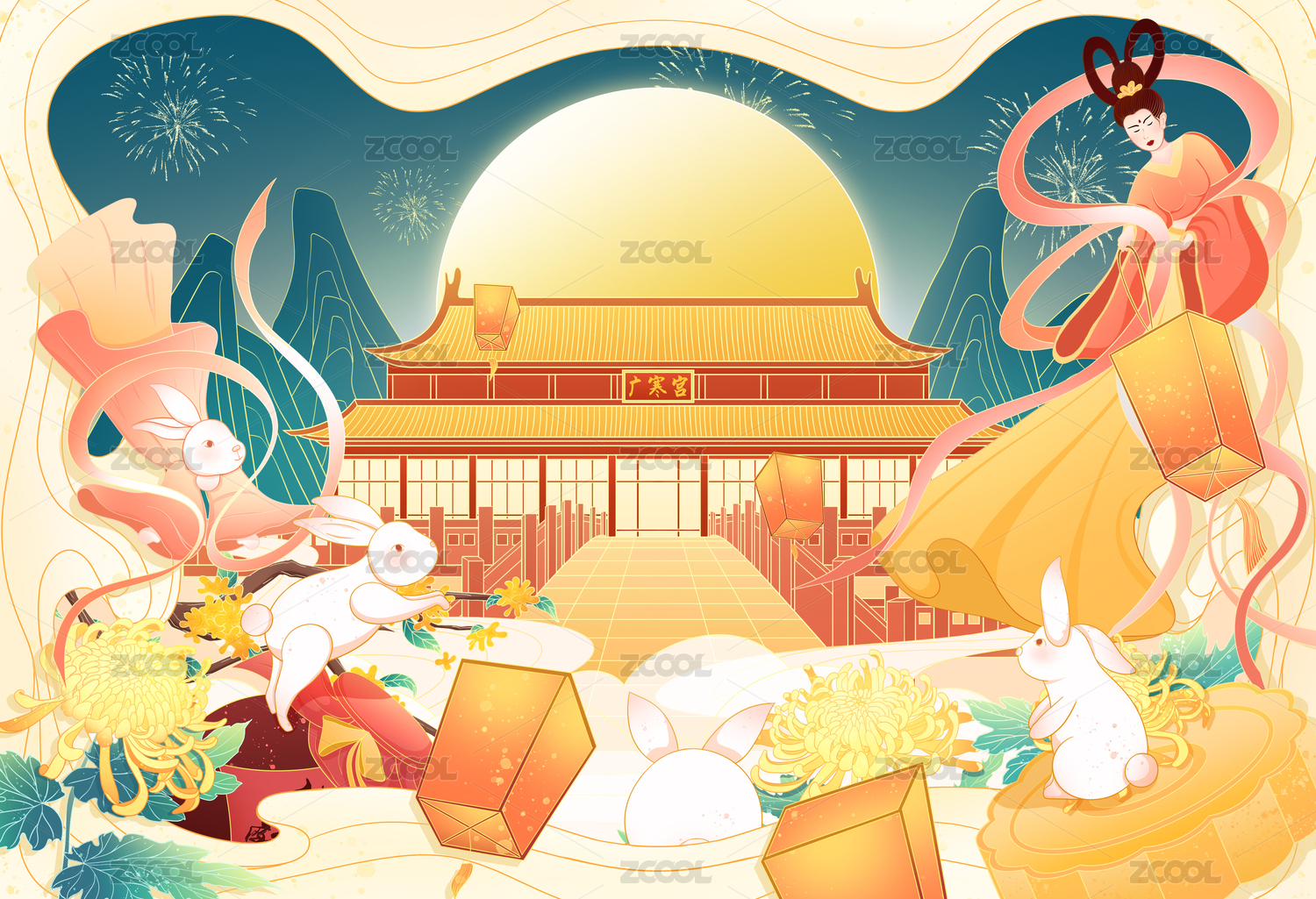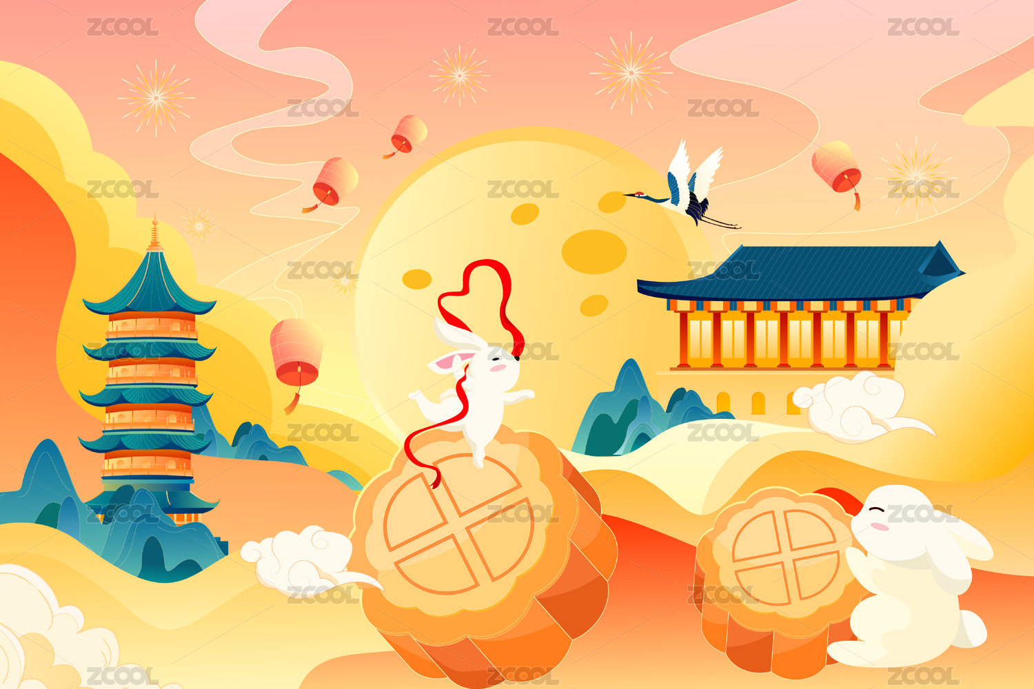 国风中秋节月亮月兔桂花月饼矢量插画海报