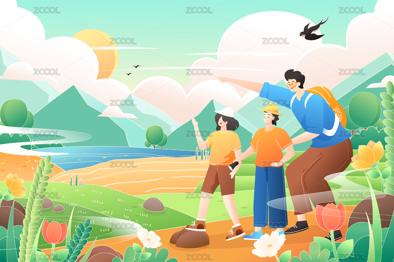 卡通立春出行亲子游踏青中国风背景矢量插画