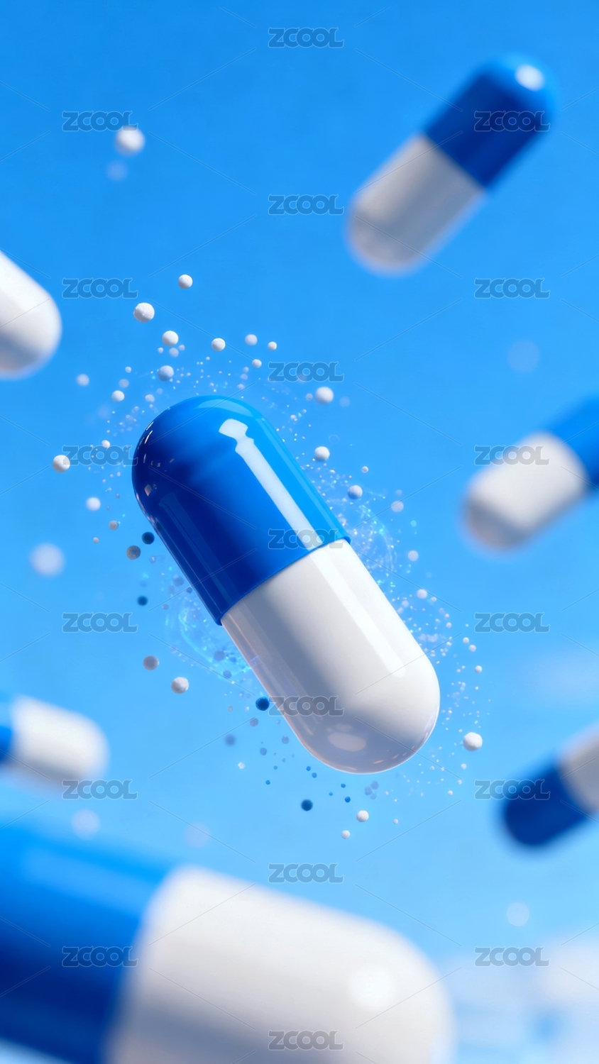 药丸,胶囊,飞行,浮动,蓝色背景,红色,橙色,蓝色,医疗,药物