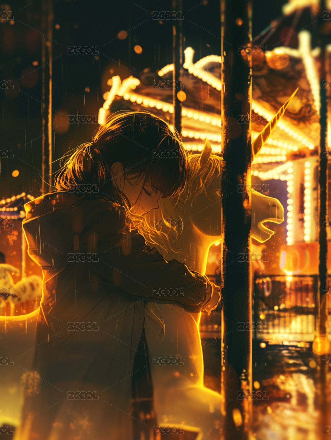 暖色唯美手绘站在花丛中的女孩治愈风景