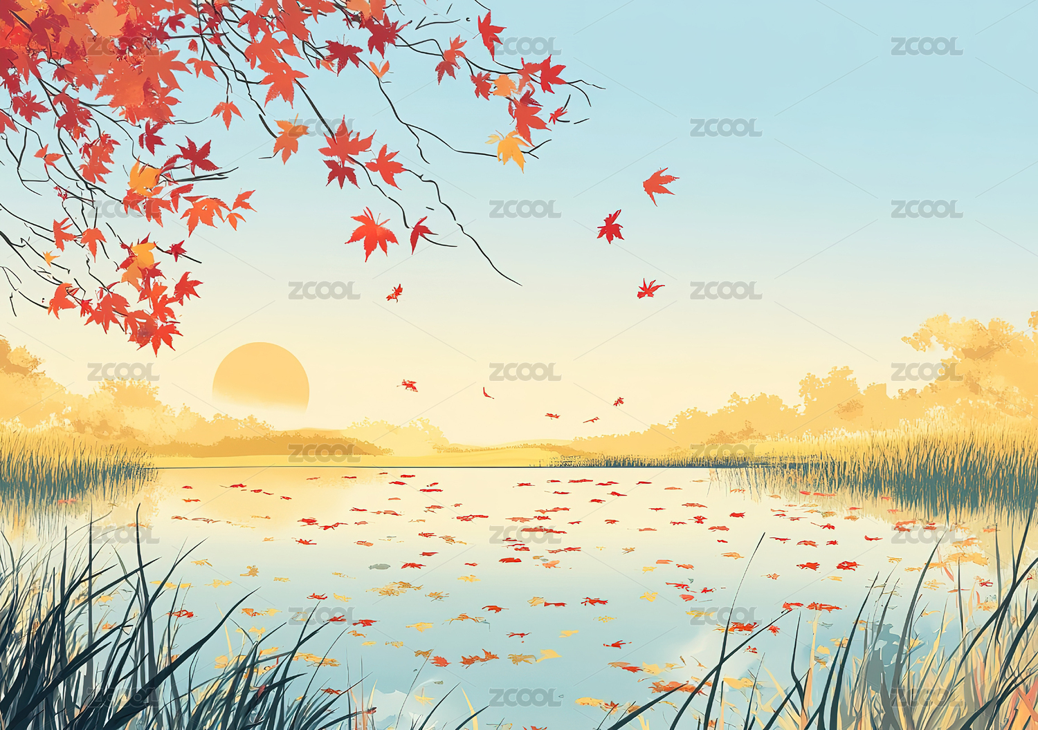 秋日山水园林景色插画