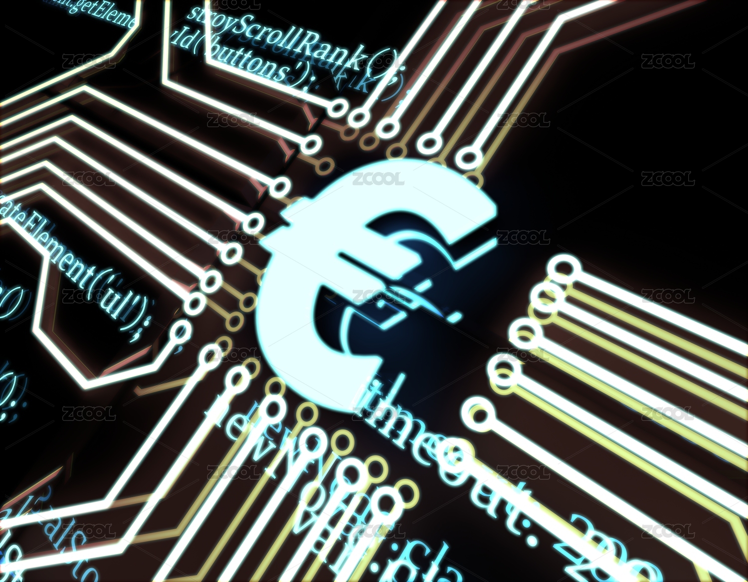 电子金融科技,网络数据传输,电路板与货币符号,欧元符号