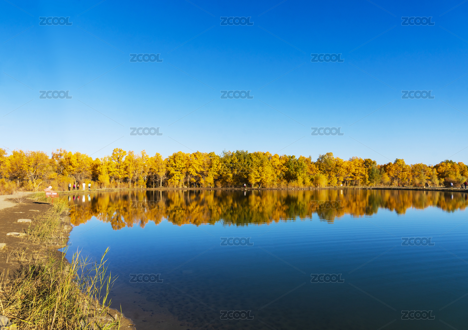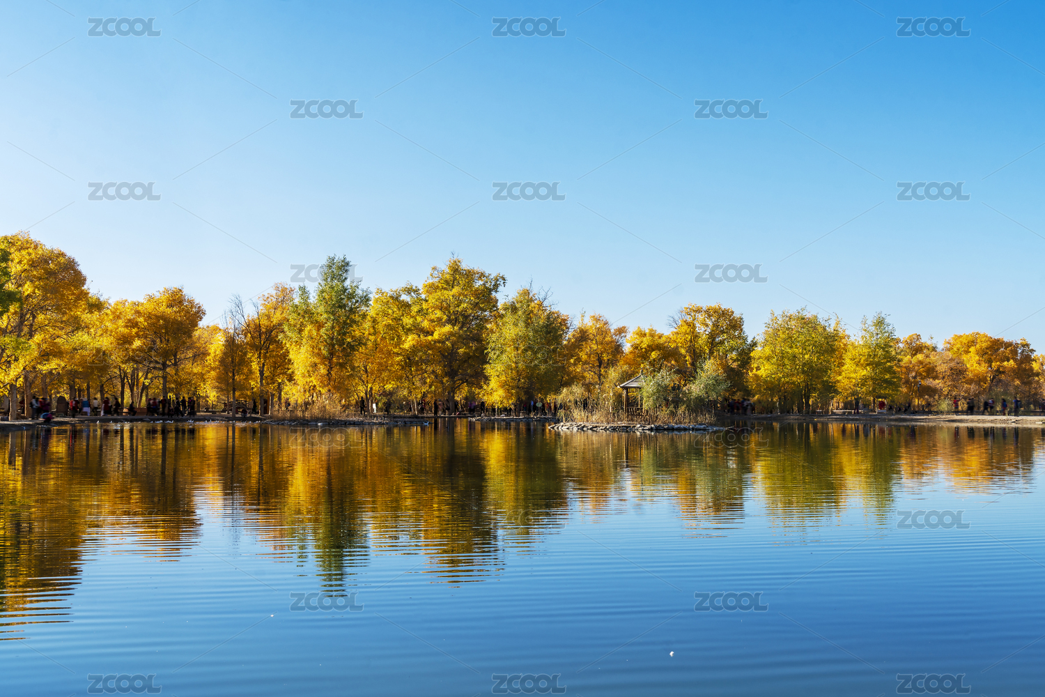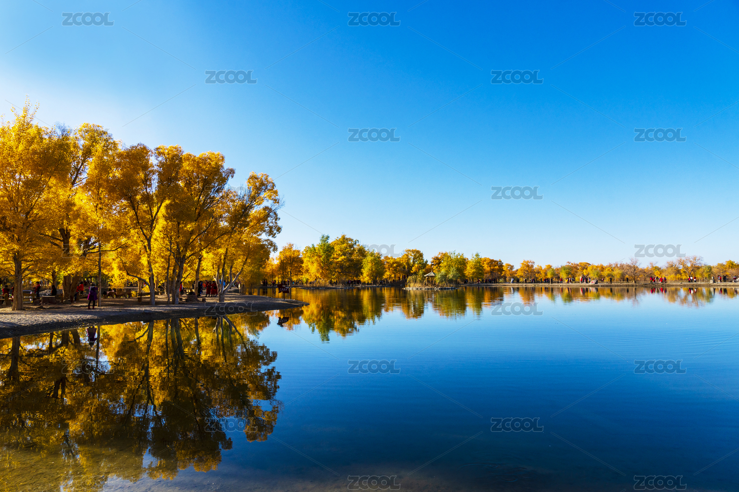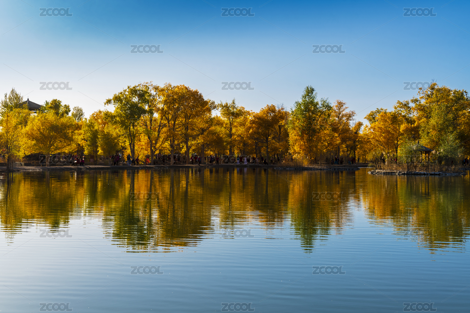 甘肃酒泉金塔胡杨林秋季湖边金色胡杨