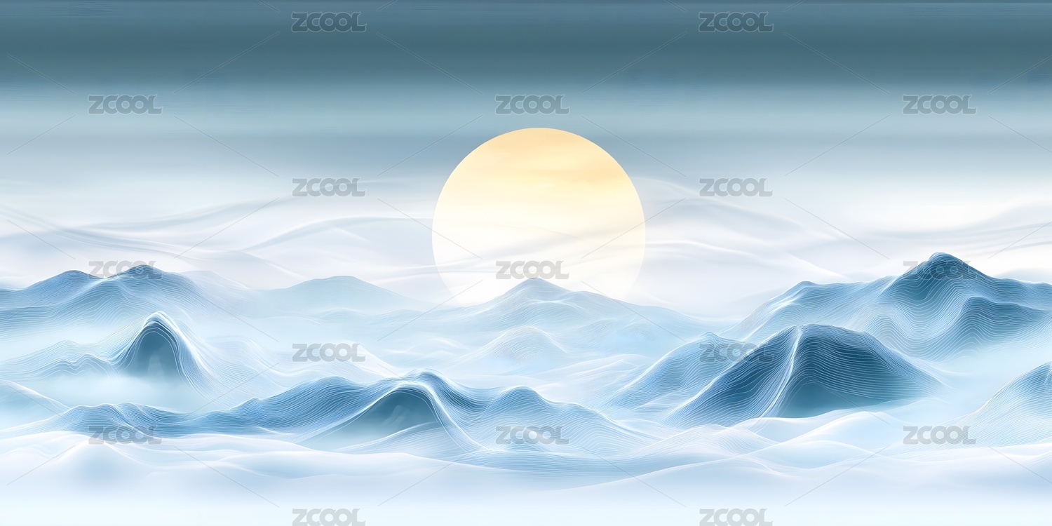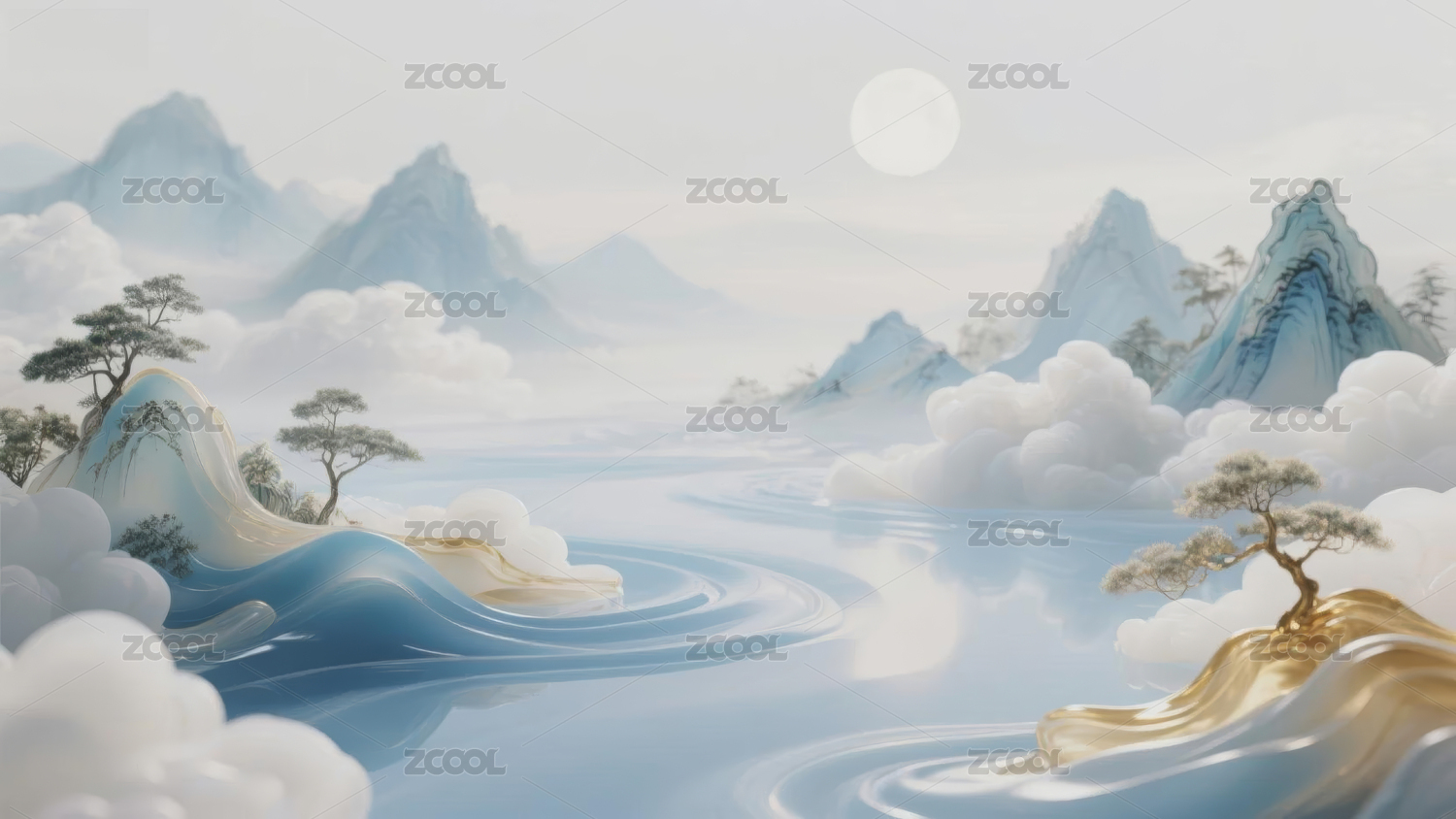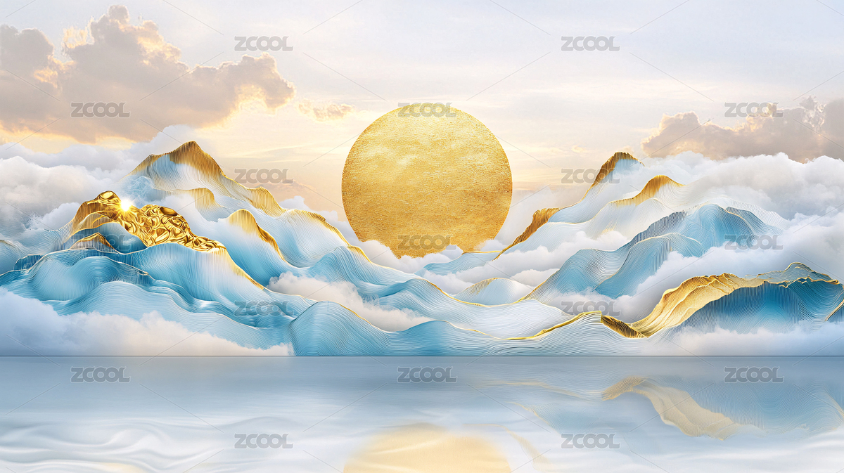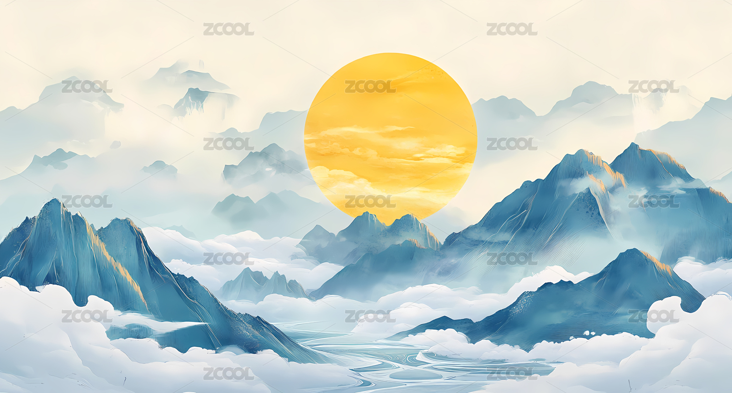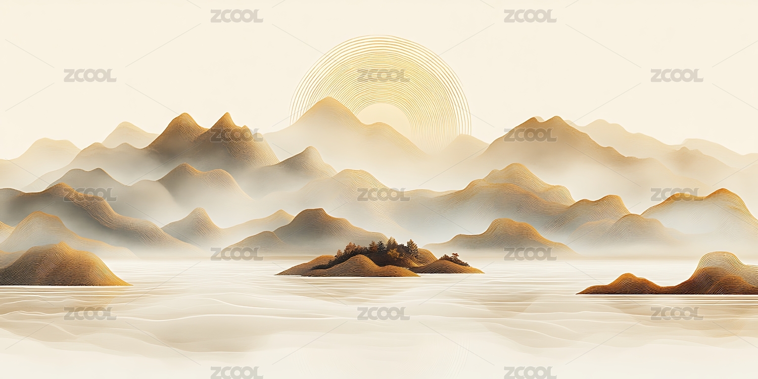 山水画,金色,山脉,湖泊,云朵,日出,日落,水墨画,中国画,意境