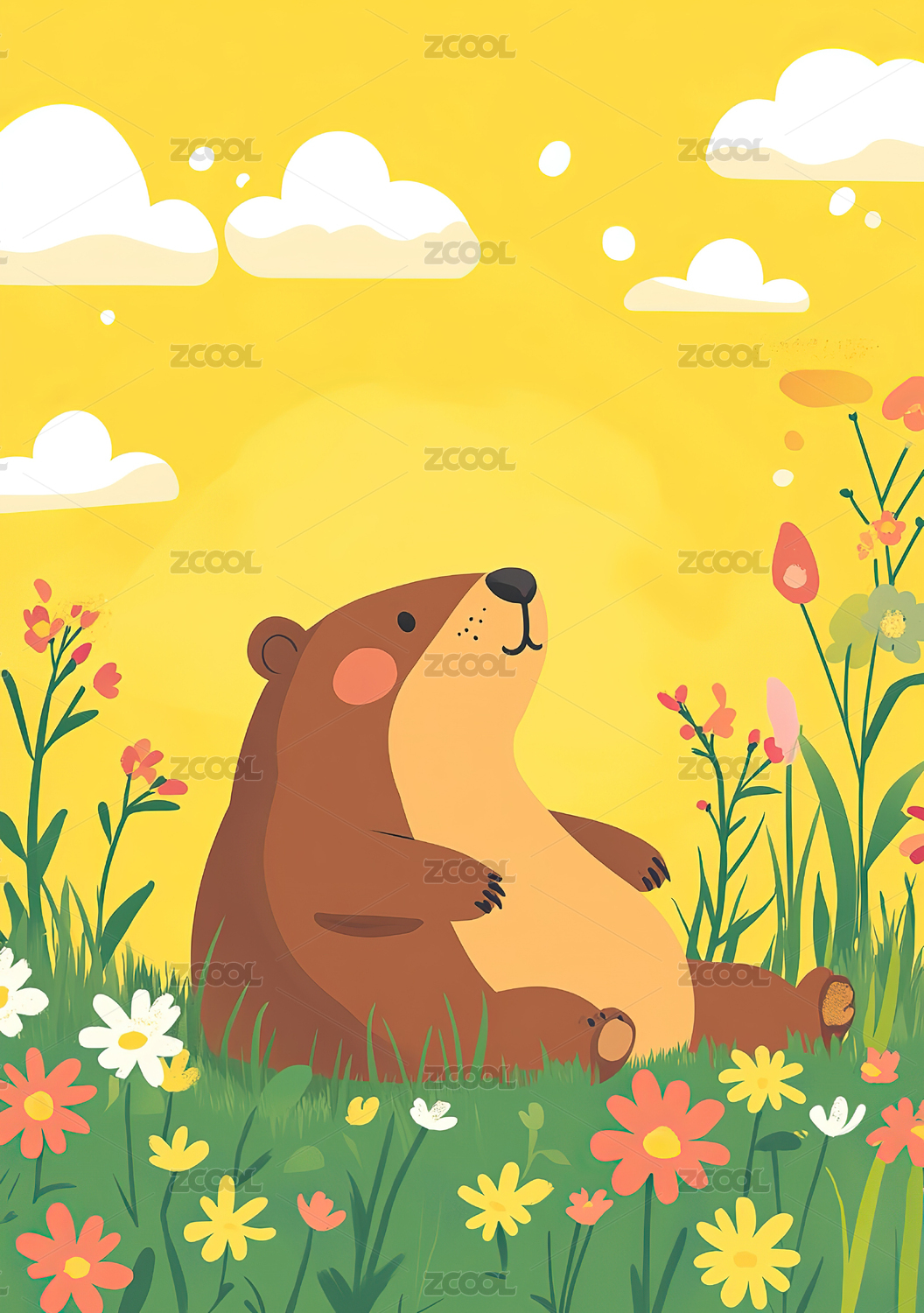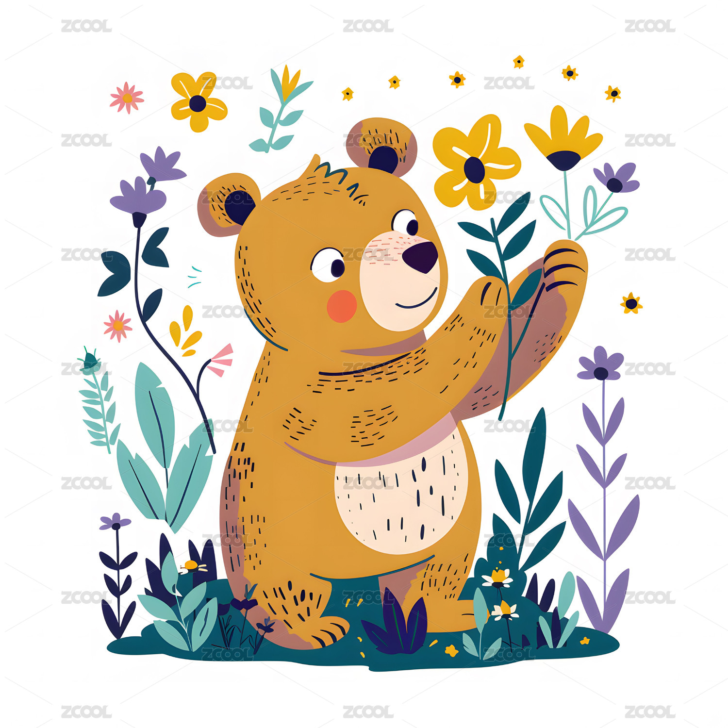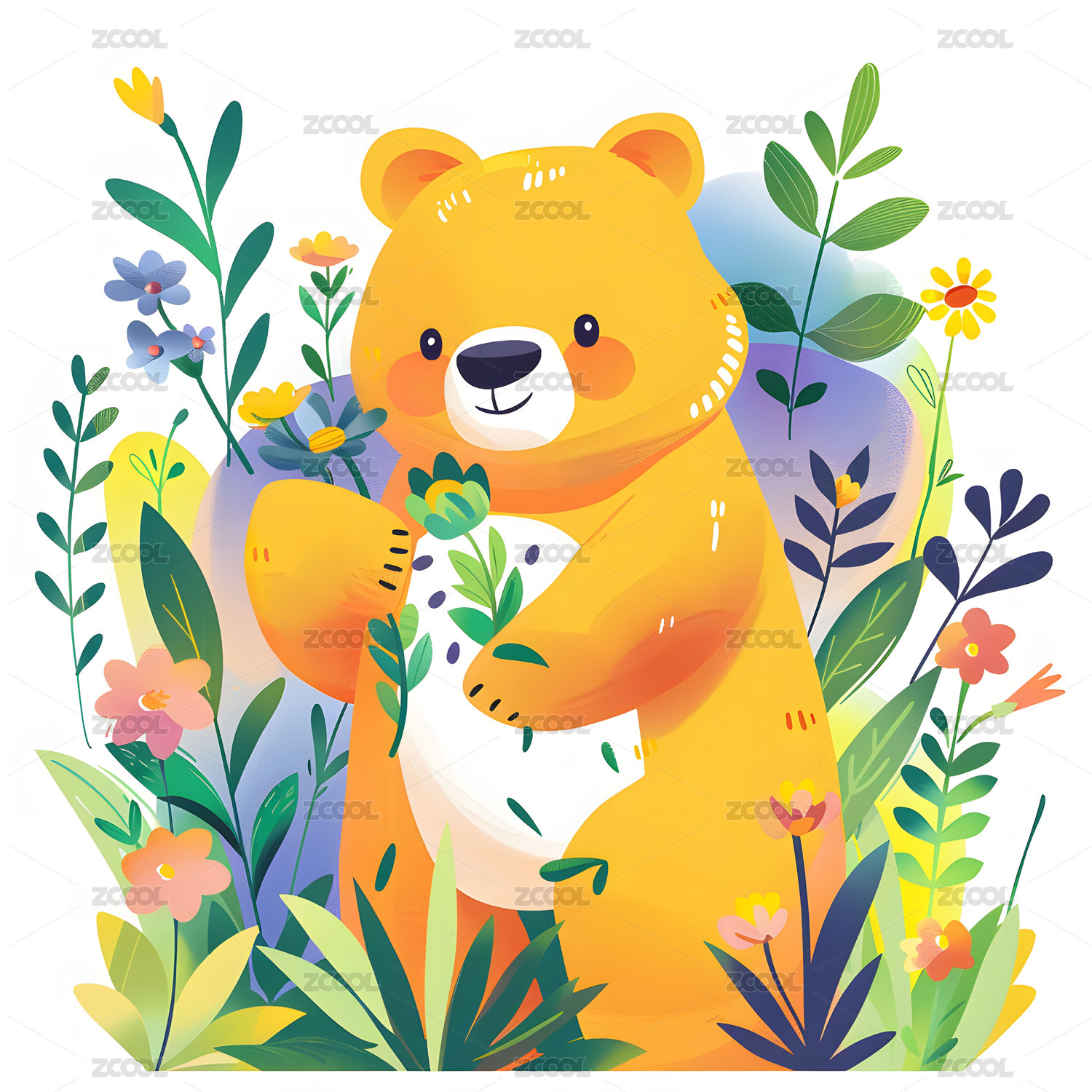黄色卡通小熊与花丛