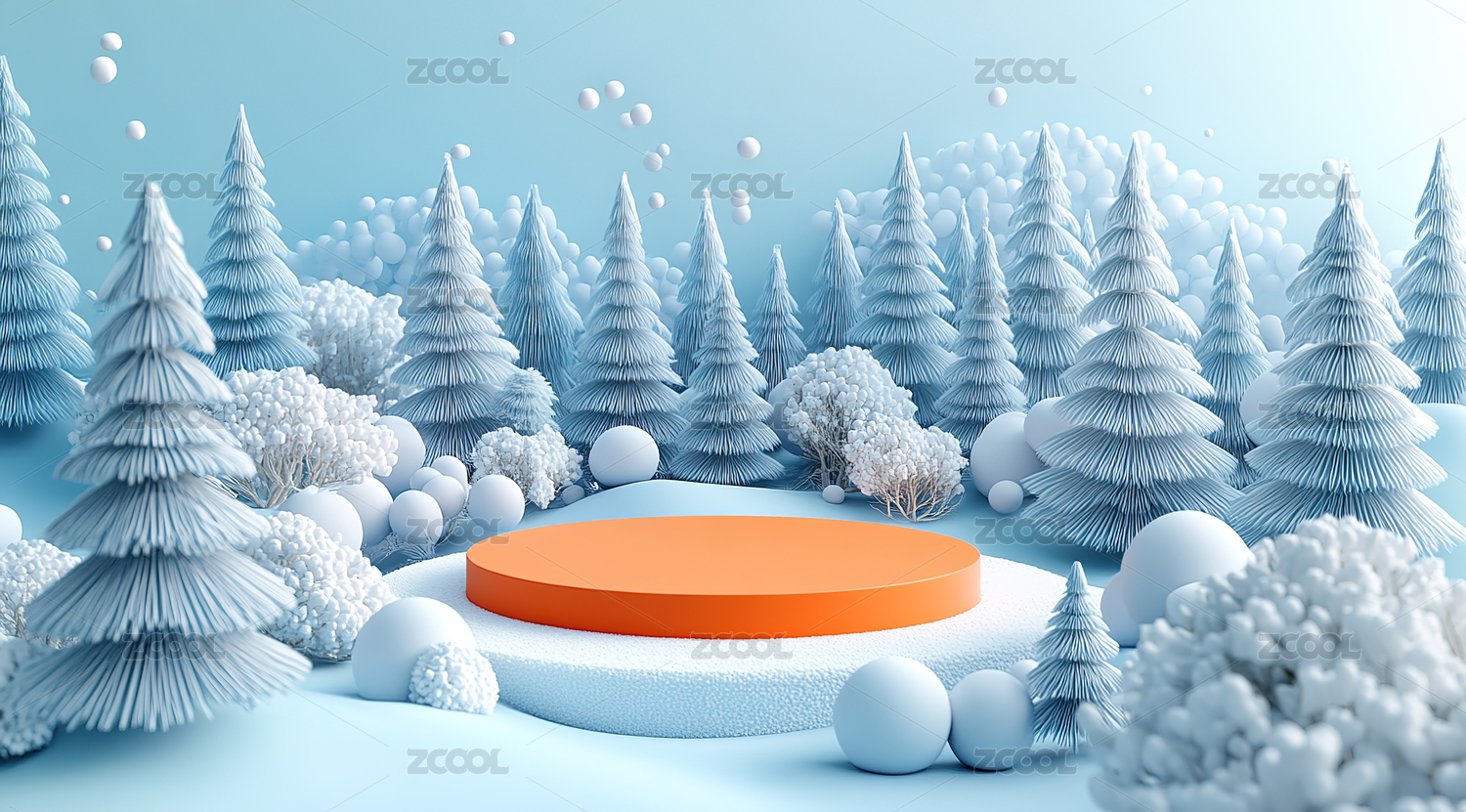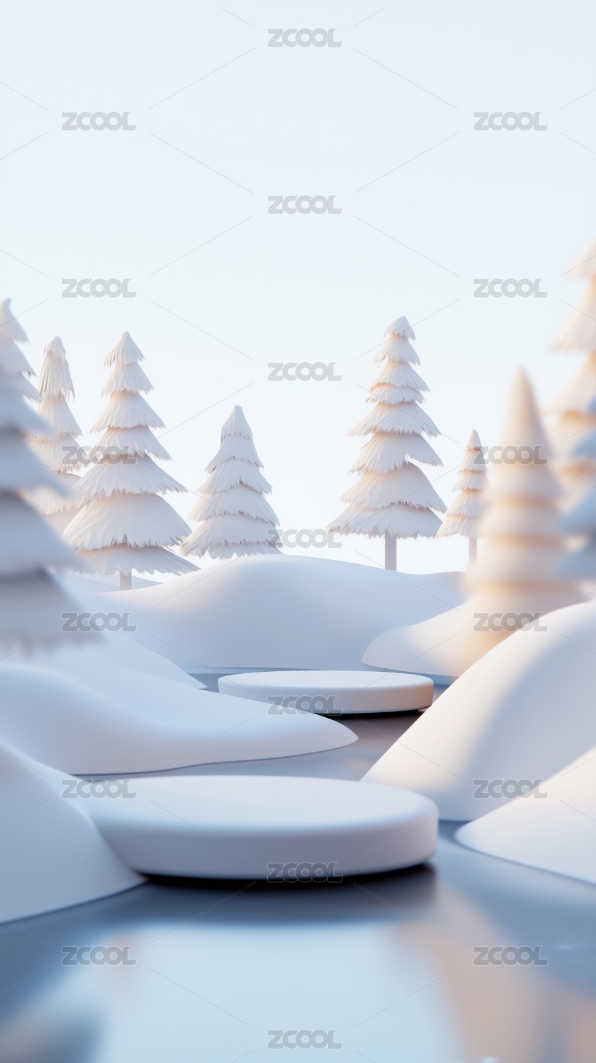 清新明亮冬天积雪山谷中的展台3D卡通插画