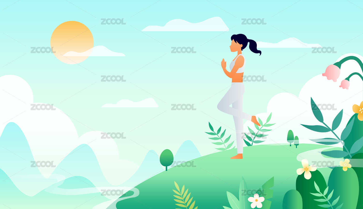 女孩在草地练习瑜伽锻炼身体的健身养生插画