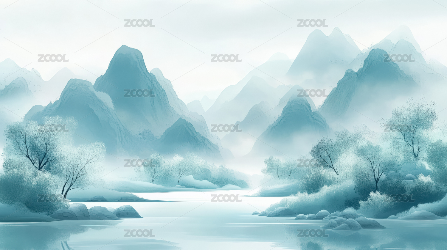青色水彩山水图