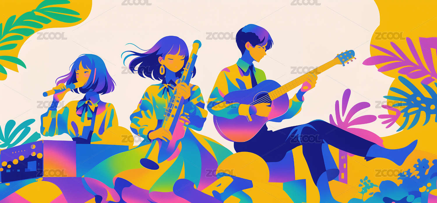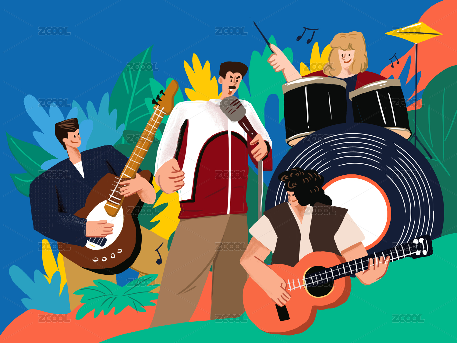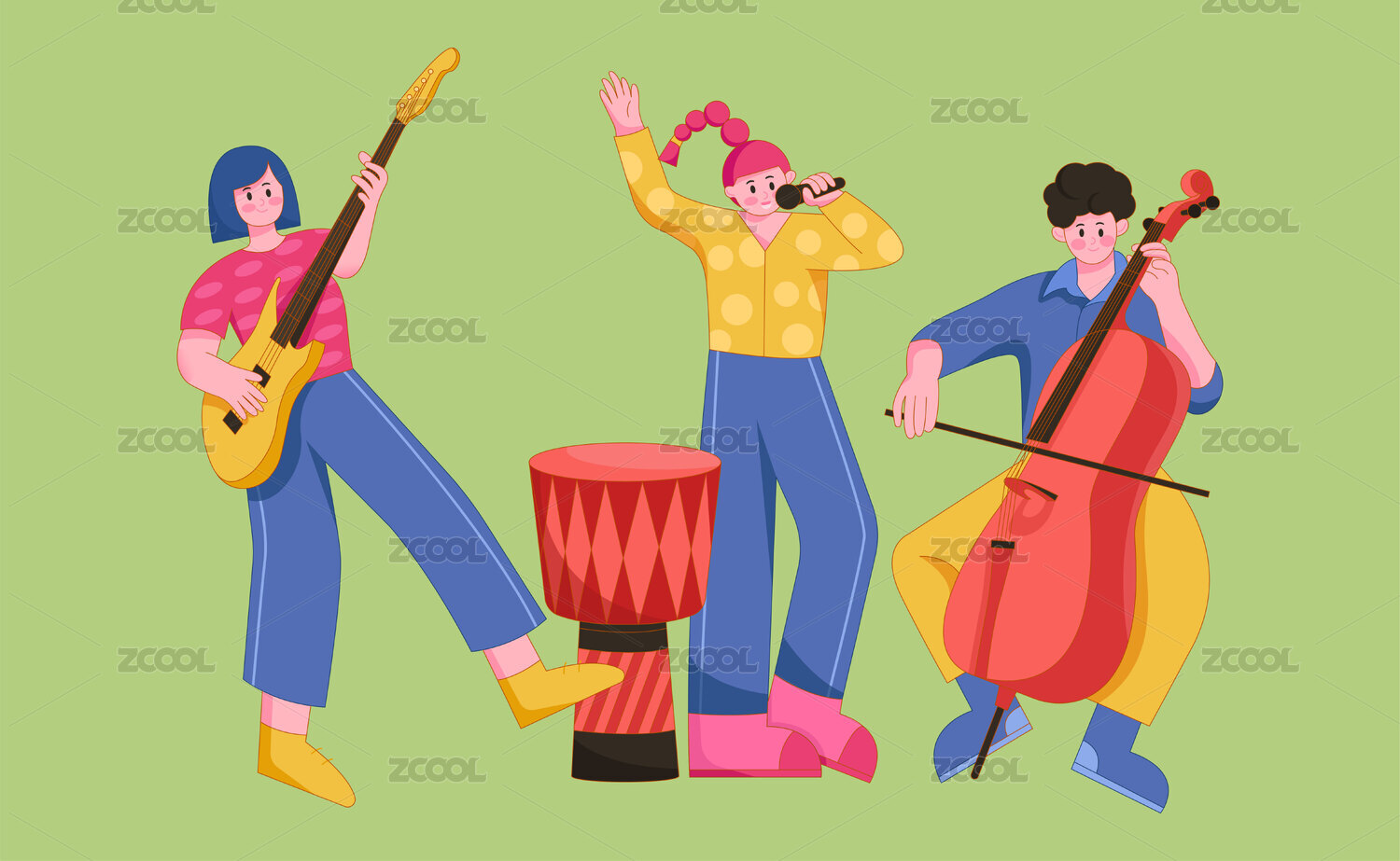 三位大学生乐队在演奏乐器叶子音乐节插画