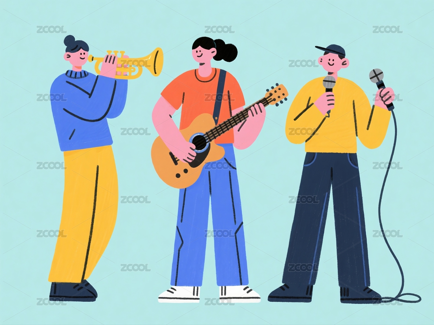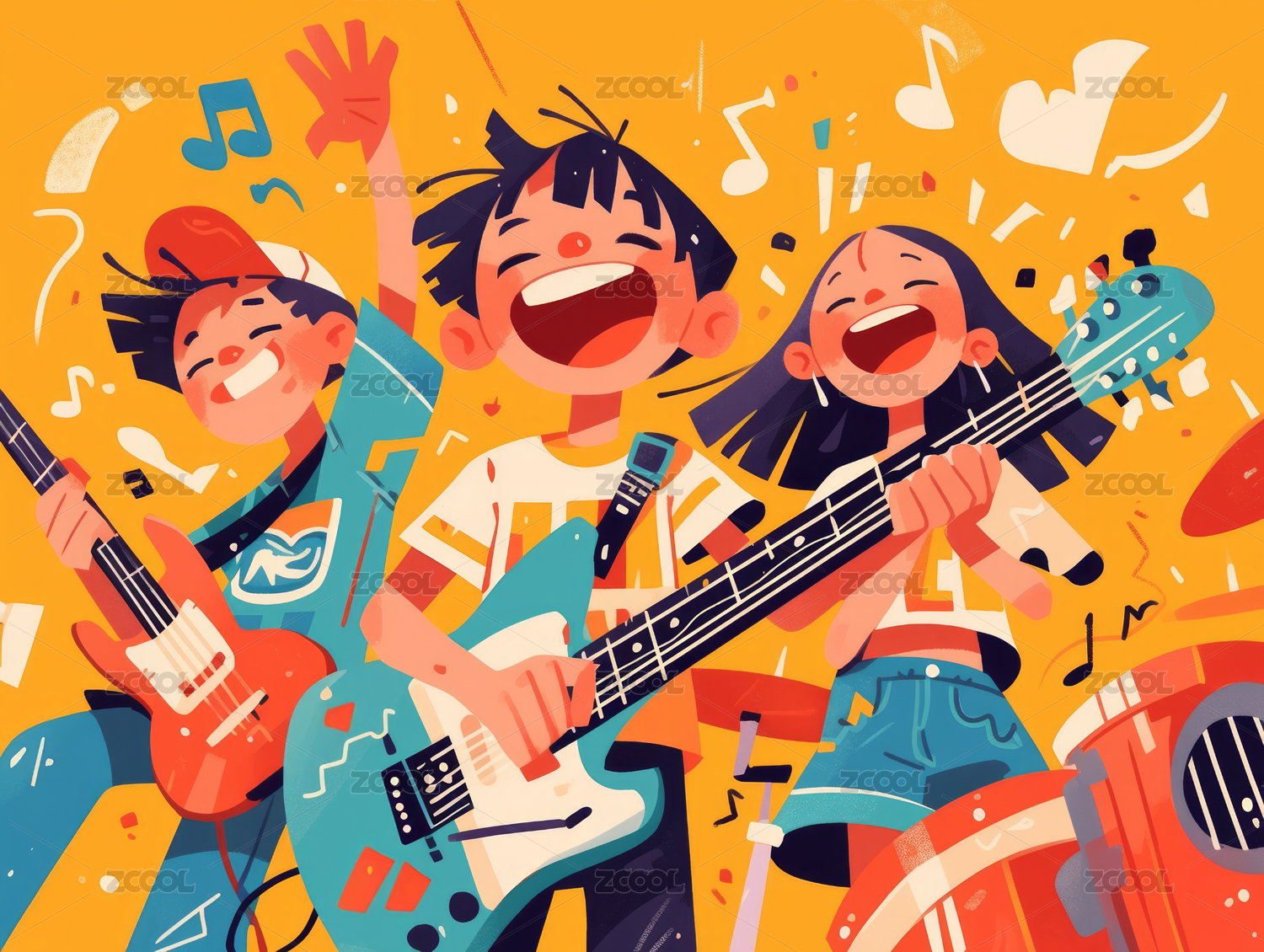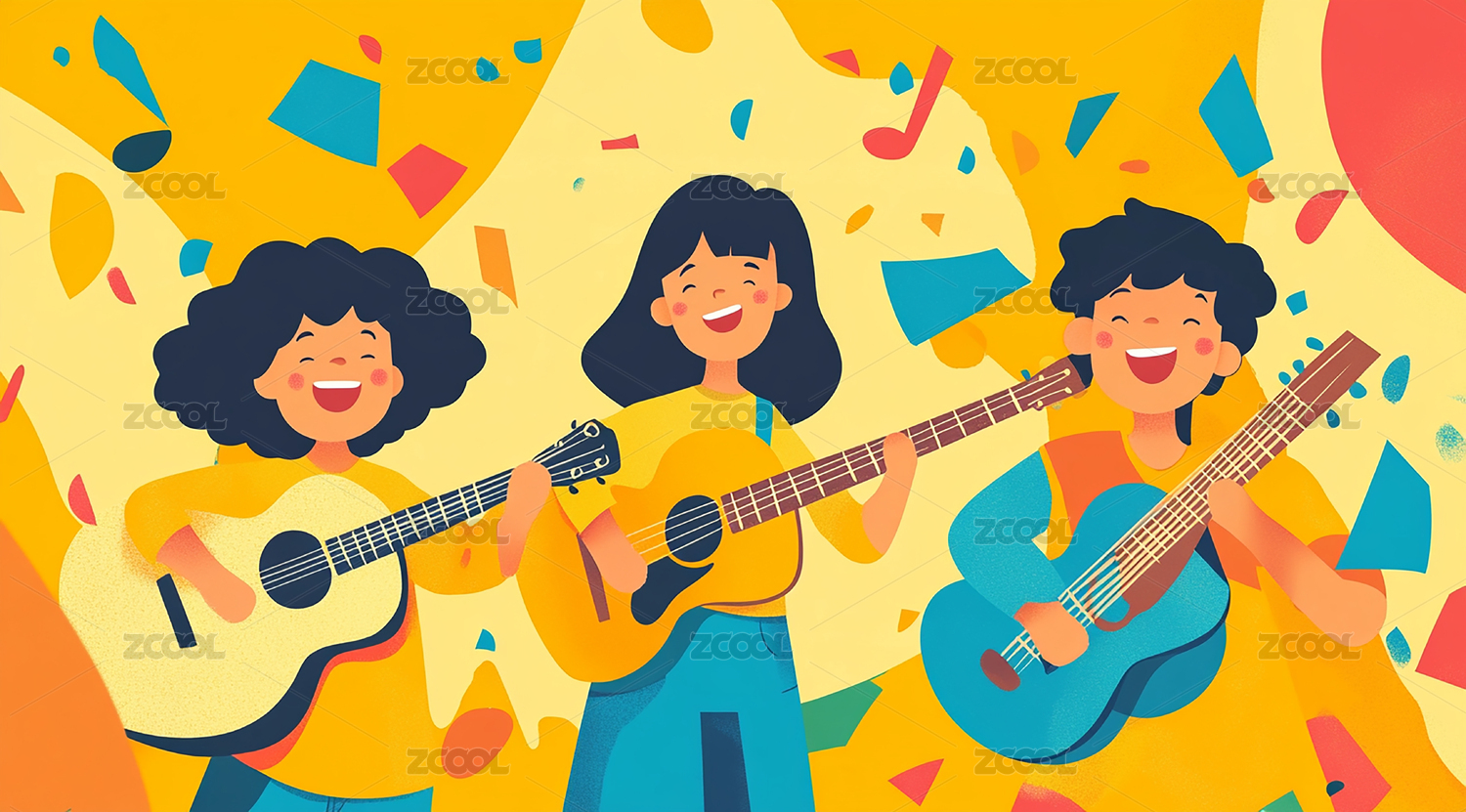 三位大学生乐队在演奏乐器叶子音乐节插画