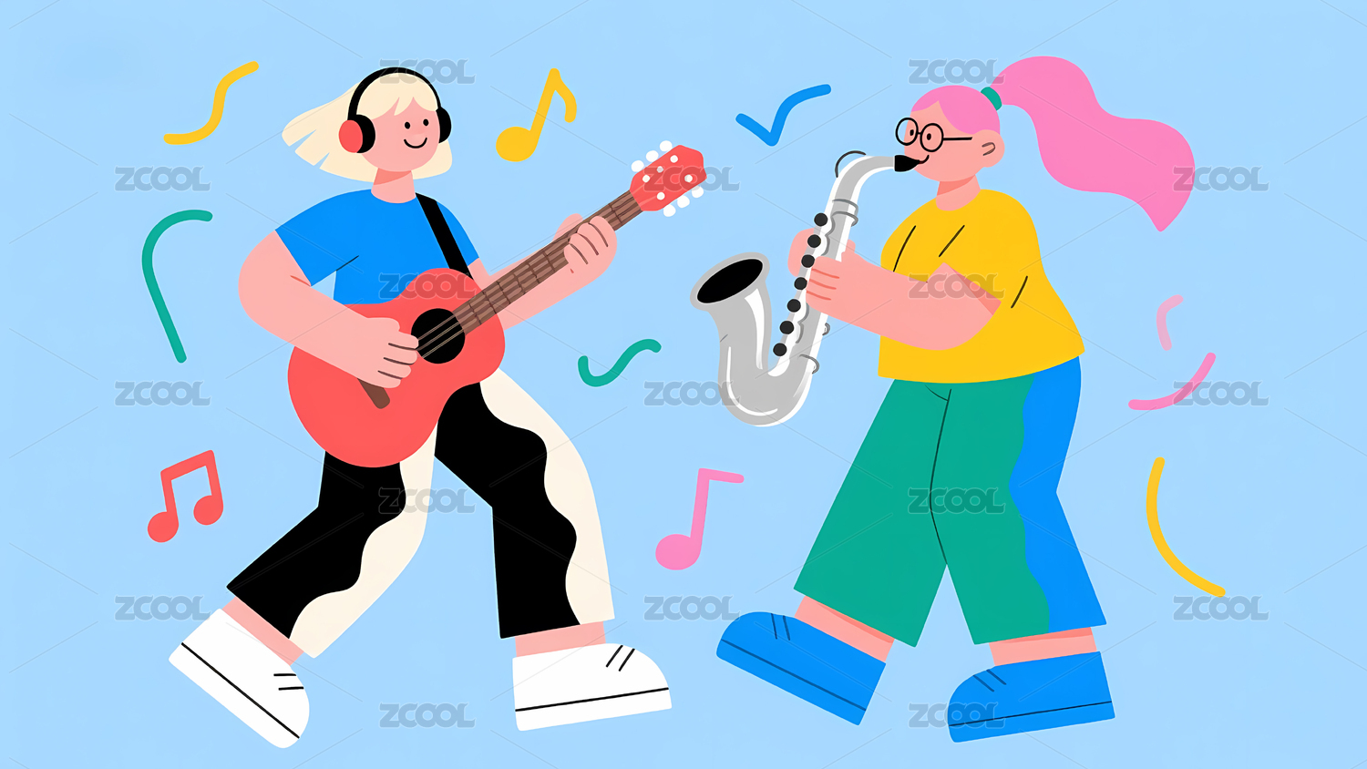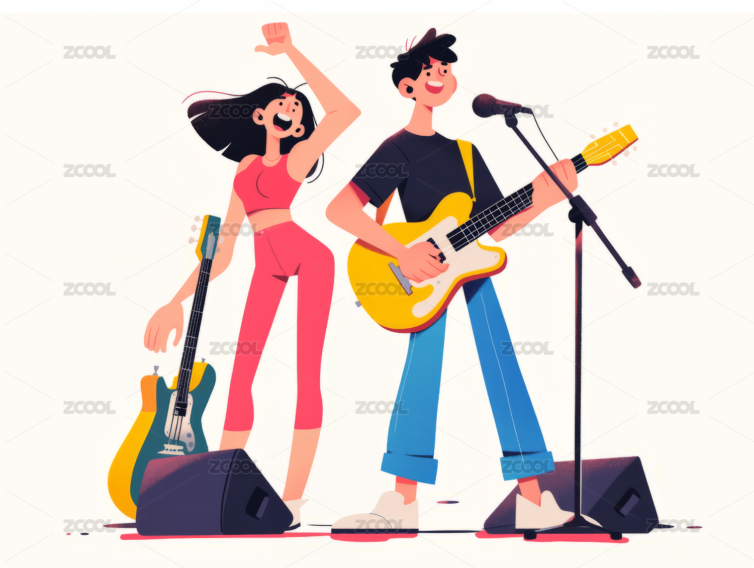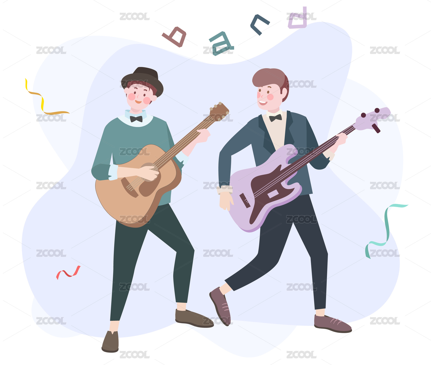 两个人开心快乐的弹奏乐器演唱音乐插画